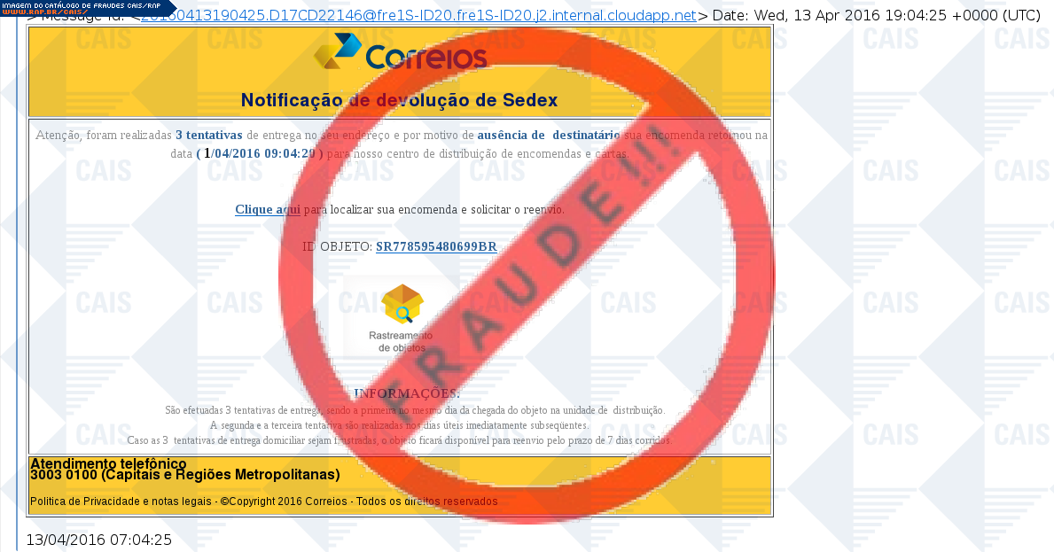 | tipo | FRAUDE - Correios devolução - Sedex | ID: 47686 |