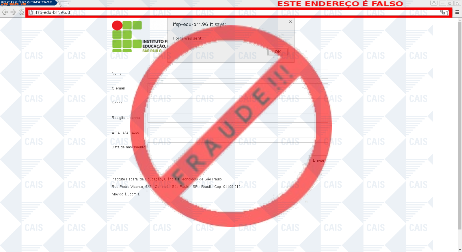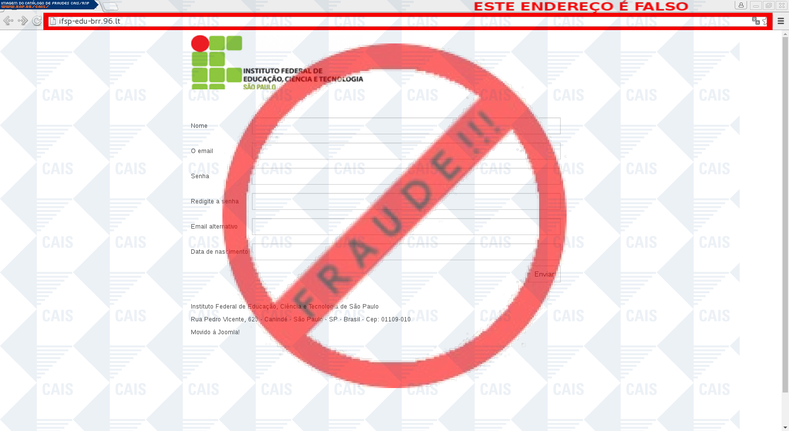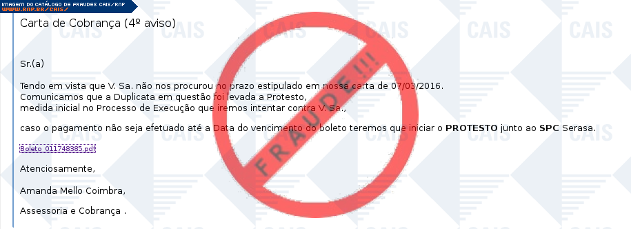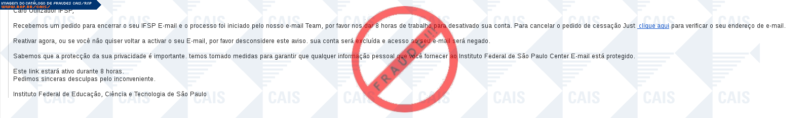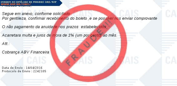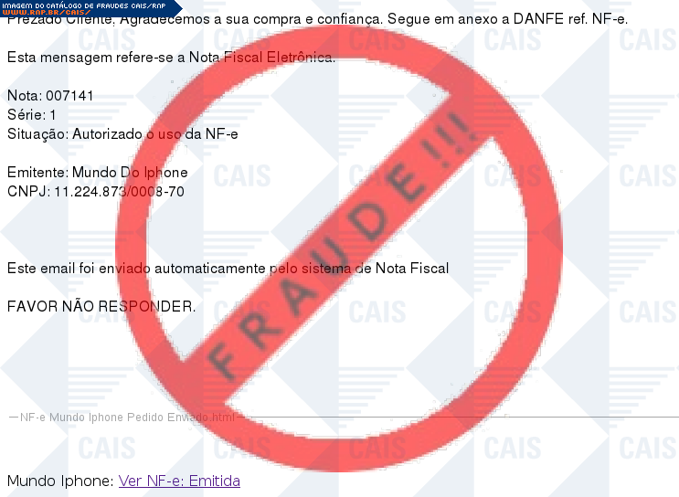 Esta página tem função informativa e educativa. Exibe uma coleção de imagens de phishing scam (fraudes eletrônicas) ou malware (código malicioso) veiculados por meio de spam (e-mail não-solicitado). Trata-se de conteúdo exemplificativo, não exaustivo, uma vez que não é possível contemplar todos os casos de fraudes existentes. Assim, caso você tenha conhecimento de um exemplar que não esteja aqui presente, isto não significa que não seja válido ou real. Inclusive incentivamos que você o envie para análise do CAIS para que, se for o caso, passe a integrar o nosso acervo.