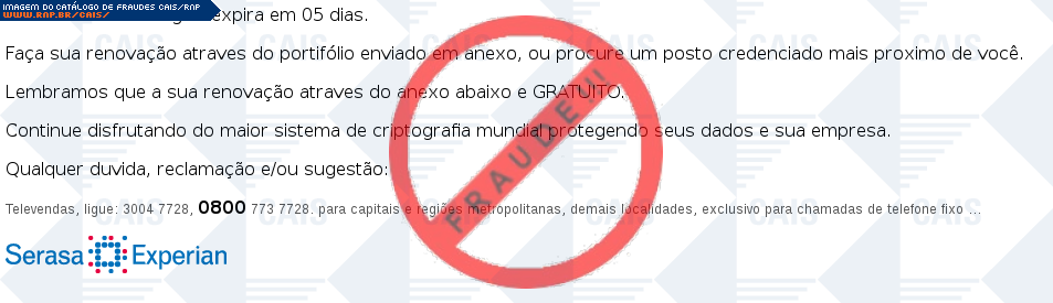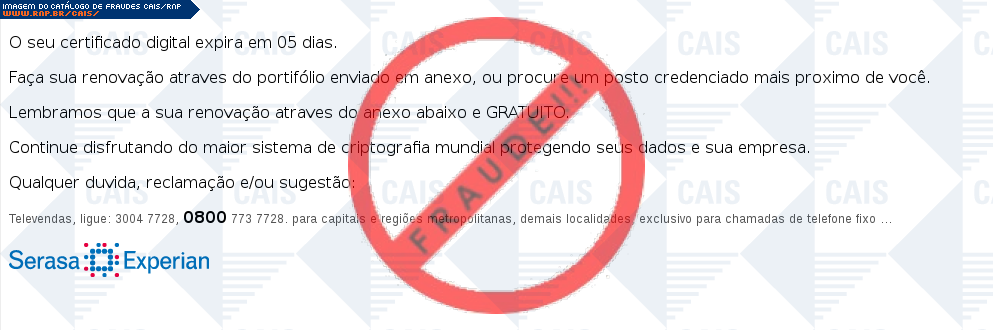 | comentário | O usuário recebe uma mensagem informando que seu certificado do Serasa Experian venceu estando a renovação em anexo, no entanto o arquivo originado é malicioso criado para roubar informações da vítima e instalar outros arquivos fraudulentos com o nome de... (leia mais) | |