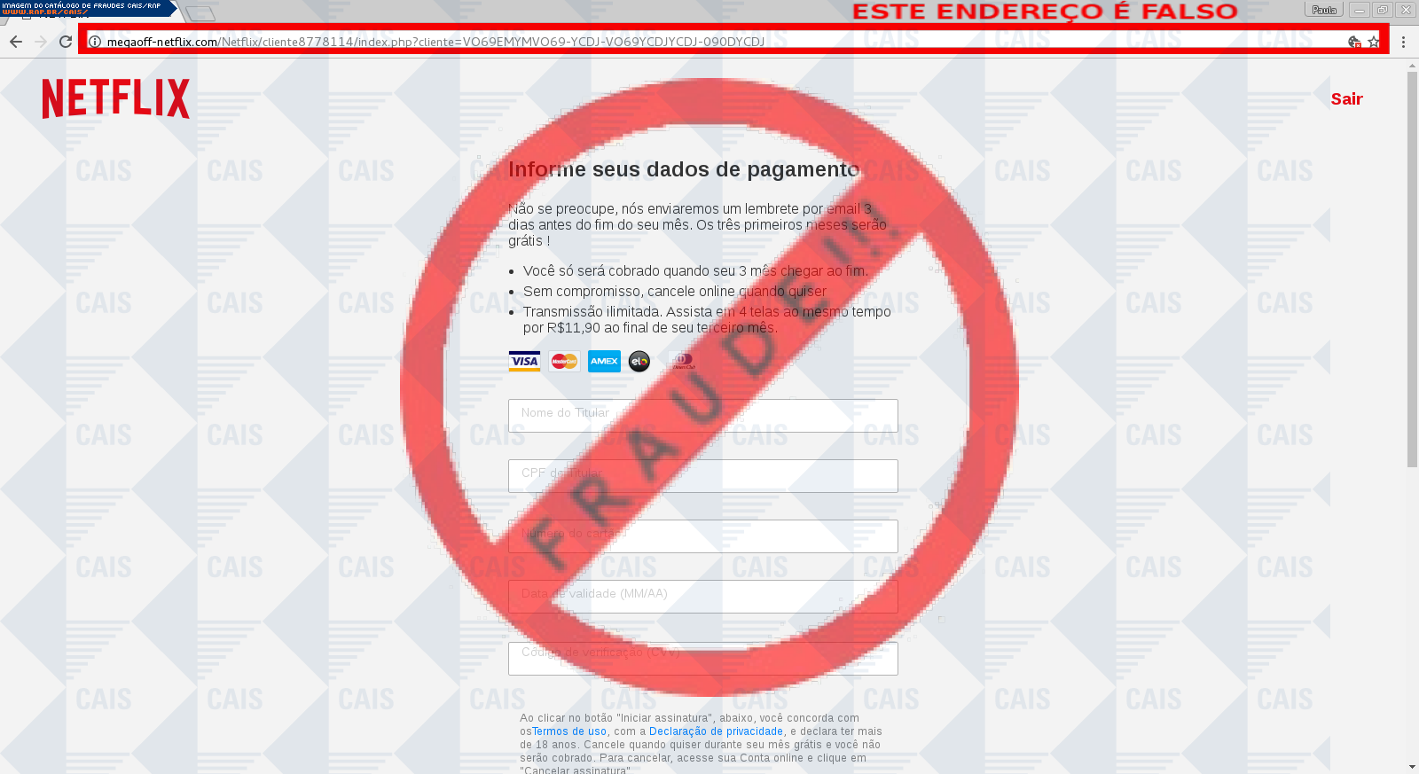 | comentário | A vítima recebe uma mensagem informando sobre uma promoção do serviço Netflix sendo necessário realizar cadastro no link disponibilizado, no entanto a página é falsa destinada a roubar as informações do usuário. | |