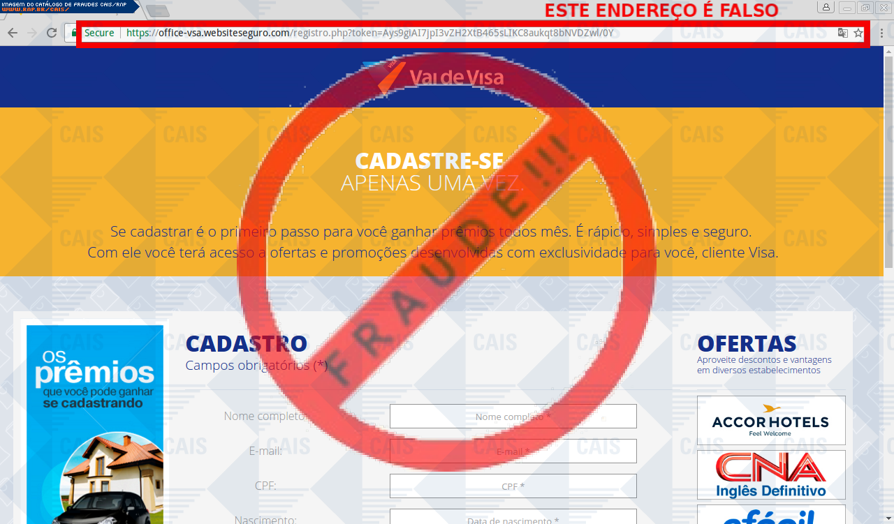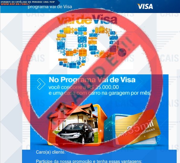 | comentário | A vítima recebe uma mensagem informando que foi sorteado na promoção Vai de Visa, sendo necessário realizar o login no link disponível, entretanto a página é falsa criada para roubar os dados bancários do usuário. | |