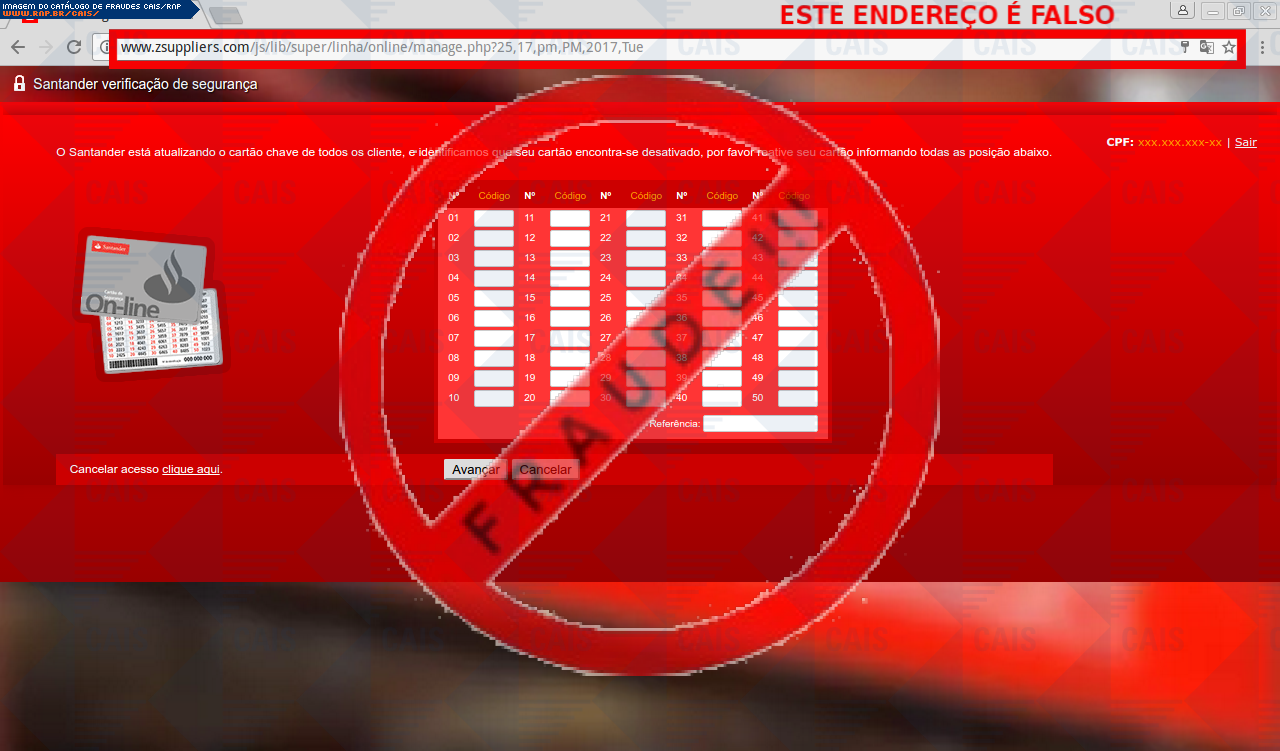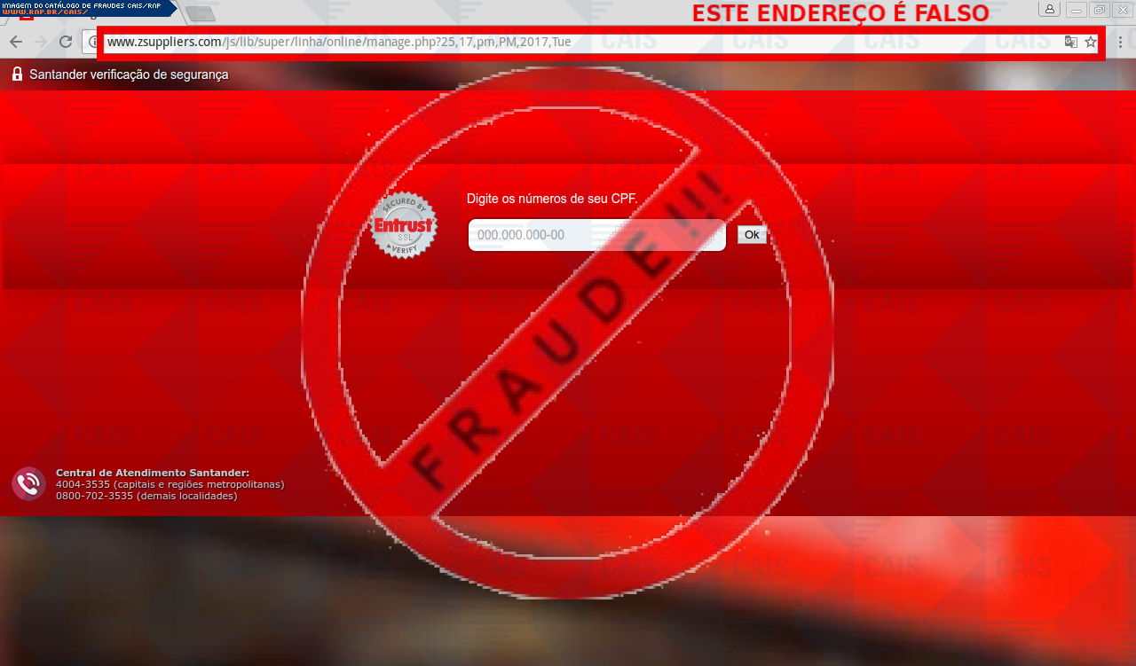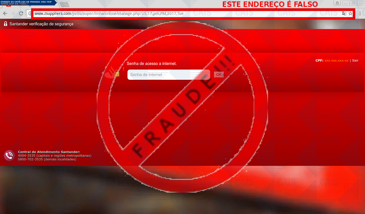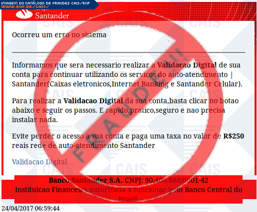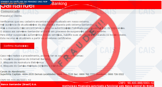 Esta página tem função informativa e educativa. Exibe uma coleção de imagens de phishing scam (fraudes eletrônicas) ou malware (código malicioso) veiculados por meio de spam (e-mail não-solicitado). Trata-se de conteúdo exemplificativo, não exaustivo, uma vez que não é possível contemplar todos os casos de fraudes existentes. Assim, caso você tenha conhecimento de um exemplar que não esteja aqui presente, isto não significa que não seja válido ou real. Inclusive incentivamos que você o envie para análise do CAIS para que, se for o caso, passe a integrar o nosso acervo.