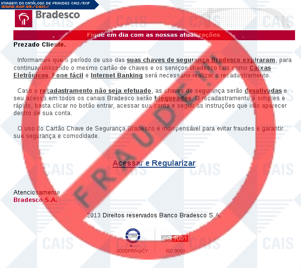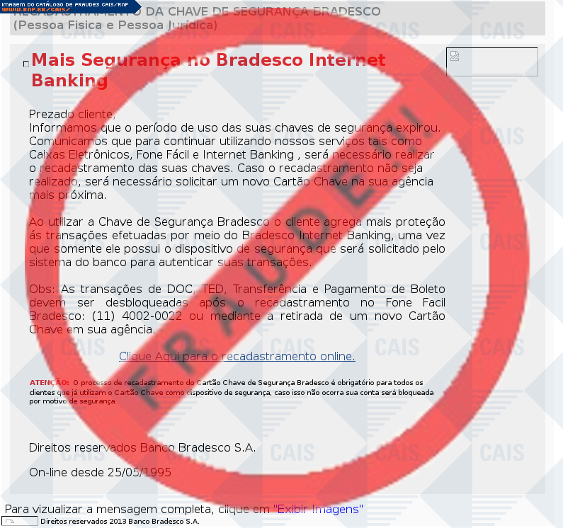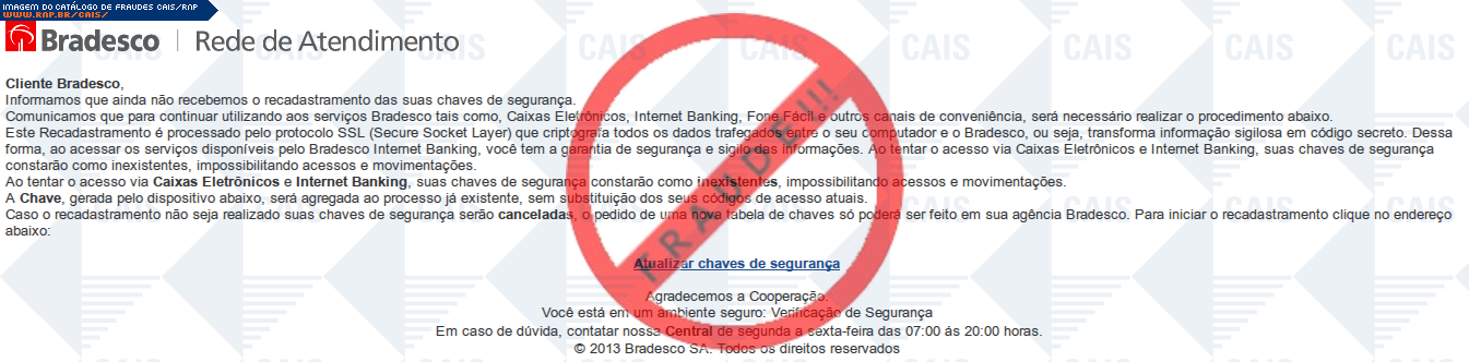 | comentário | Nessa fraude o usuário recebe um email orientando-o a recadastrar suas chaves de acesso aos serviços bancários, mas o link disponibilizado na mensagem leva o usuário a uma página utilizada para a prática de phishing. | |