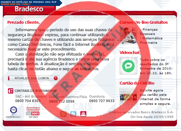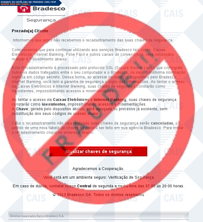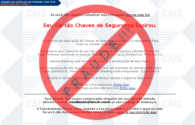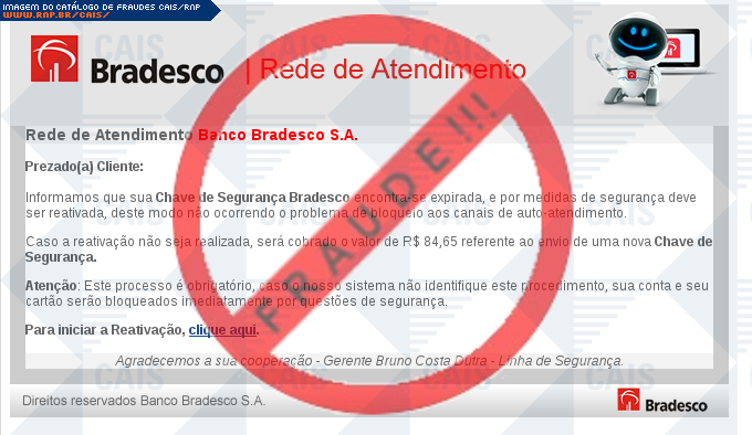 | comentário | Phishing: O fraudador envia um e-mail ao usuário informando que sua chave de segurança expirou e que o mesmo deverá acessar o internet banking para atualizar os seus dados e evitar o bloqueio dos serviços. Porém o link direciona o usuário a uma pagina falsa... (leia mais) | |