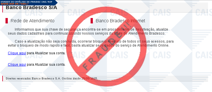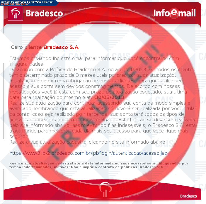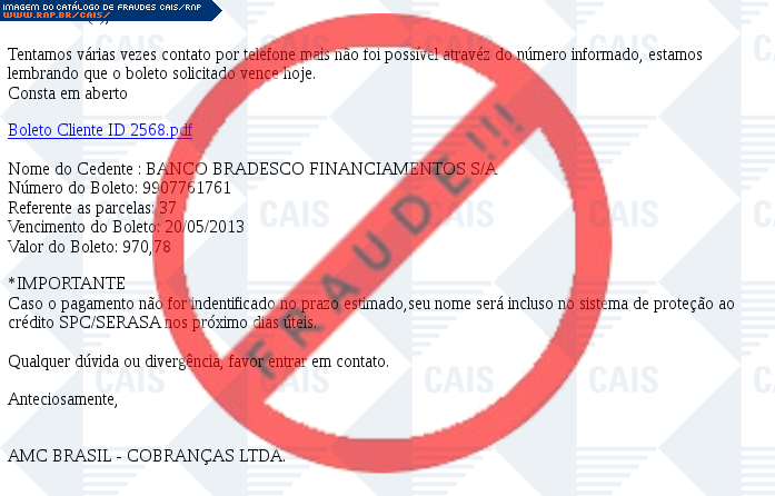 Esta página tem função informativa e educativa. Exibe uma coleção de imagens de phishing scam (fraudes eletrônicas) ou malware (código malicioso) veiculados por meio de spam (e-mail não-solicitado). Trata-se de conteúdo exemplificativo, não exaustivo, uma vez que não é possível contemplar todos os casos de fraudes existentes. Assim, caso você tenha conhecimento de um exemplar que não esteja aqui presente, isto não significa que não seja válido ou real. Inclusive incentivamos que você o envie para análise do CAIS para que, se for o caso, passe a integrar o nosso acervo.