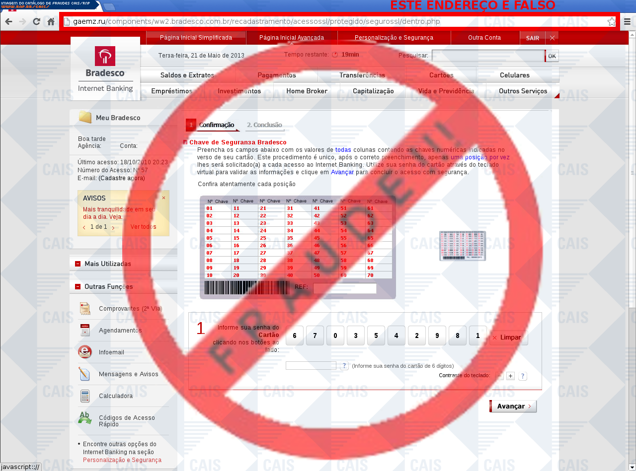 | comentário | Phishing: Essa fraude é direcionada a usuario do internet banking, nesse caso o fraudador encaminha um ao usuario informando-o que a sua chave de segurança para acesso aos serviços do banco expirou. E que o mesmo deverá acessar o site através do link disponibilizado... (leia mais) | |