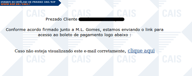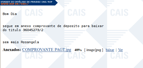 | comentário | A fraude se passa pelo envio de um boleto. O link para o suposto arquivo leva ao malware Trojan.Crypt.Delf.AG (BitDefender). | |