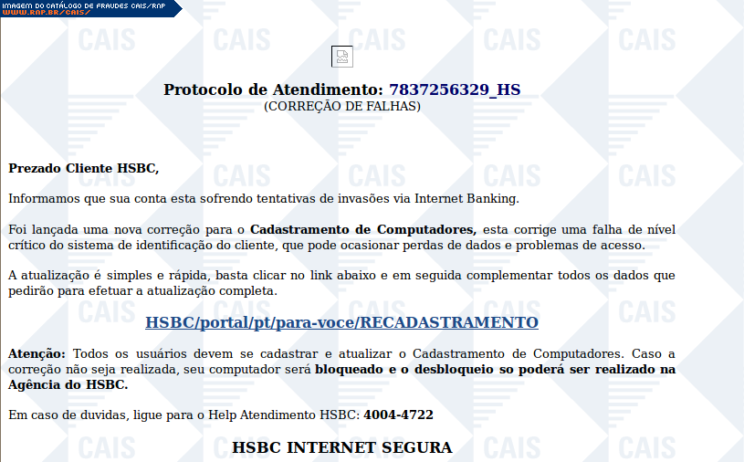 | comentário | A mensagem, em nome do banco HSBC, informa que a vítima deve realizar um recadastramento para a correção de falhas. O link para o suposto recadastramento leva a conteúdo malicioso que não estava mais disponível no momento da análise. | |