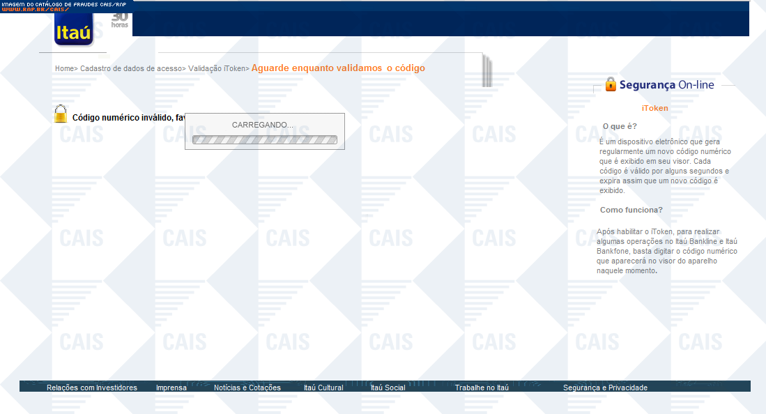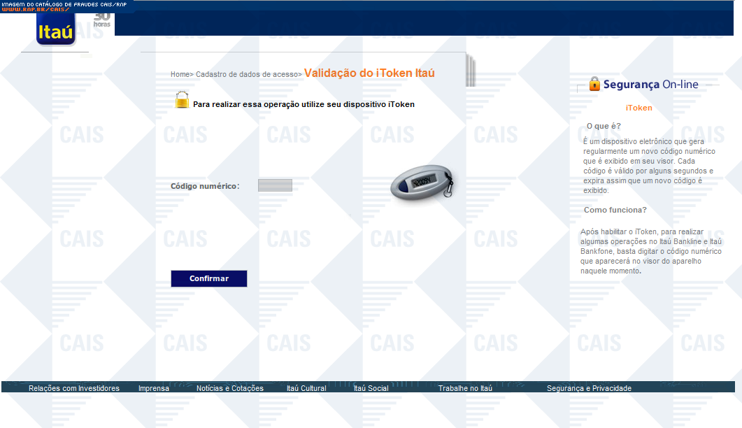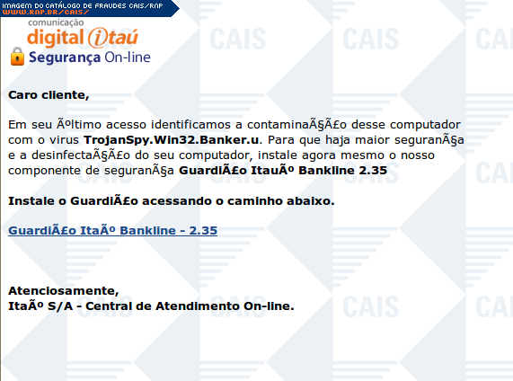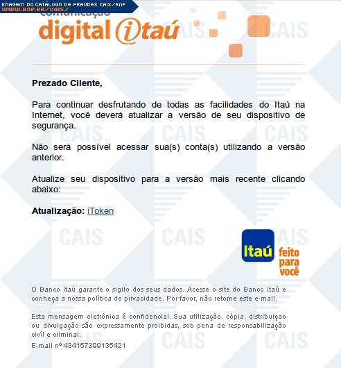 | comentário | Comunicado em nome do banco Itaú informando que a vítima deve atualizar seu dispositivo de segurança. O link leva ao malware Trojan-Banker.Win32.Banbra (Ikarus). | |