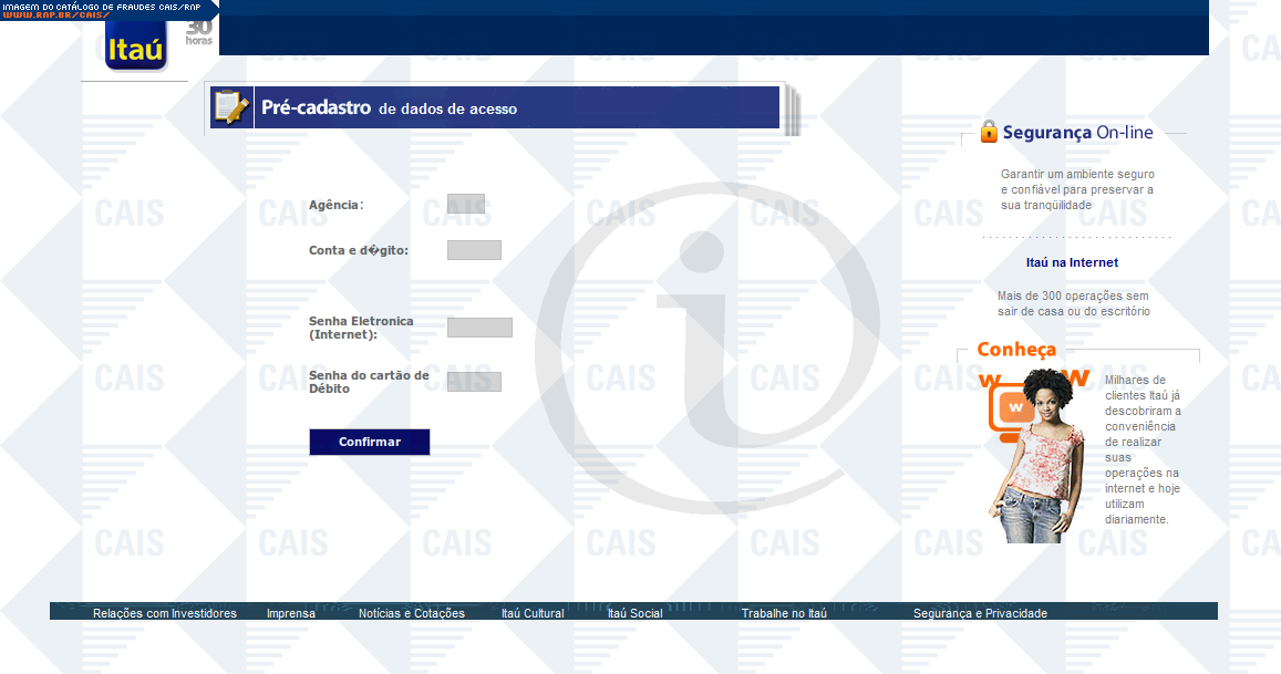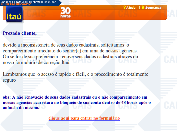 | comentário | A mensagem, em nome do banco Itaú, informa que devido a inconsistências nos dados da vítima, deve ser realizada a atualização dos seus dados cadastrais. O link para o formulário de correção dos dados leva a conteúdo malicioso que não estava mais disponível... (leia mais) | |