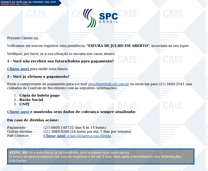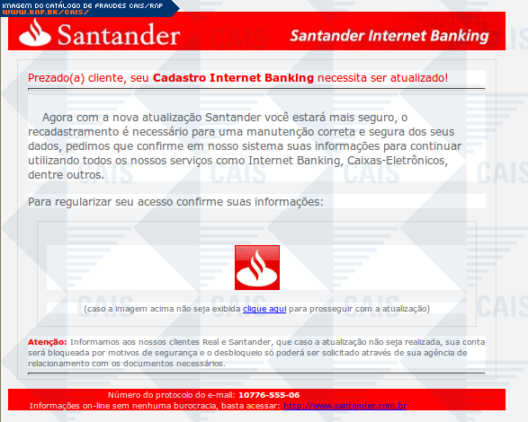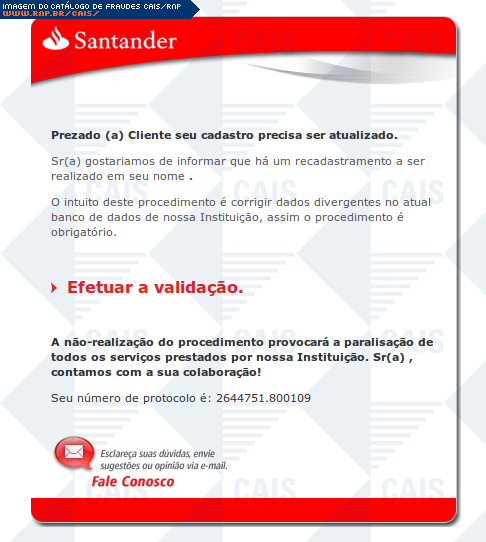 Esta página tem função informativa e educativa. Exibe uma coleção de imagens de phishing scam (fraudes eletrônicas) ou malware (código malicioso) veiculados por meio de spam (e-mail não-solicitado). Trata-se de conteúdo exemplificativo, não exaustivo, uma vez que não é possível contemplar todos os casos de fraudes existentes. Assim, caso você tenha conhecimento de um exemplar que não esteja aqui presente, isto não significa que não seja válido ou real. Inclusive incentivamos que você o envie para análise do CAIS para que, se for o caso, passe a integrar o nosso acervo.