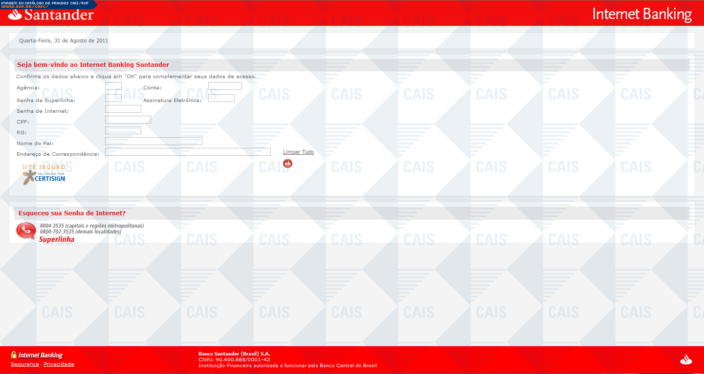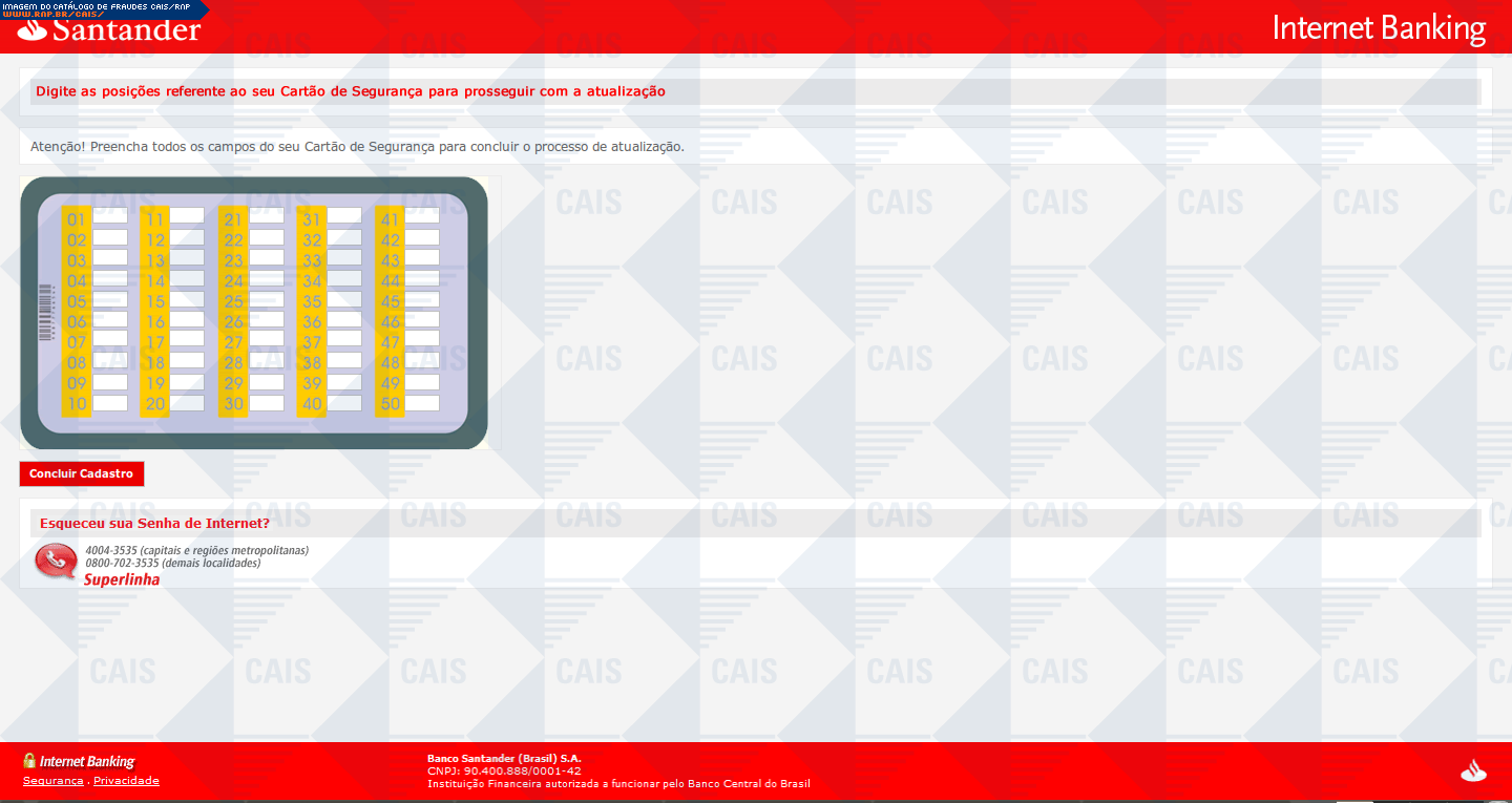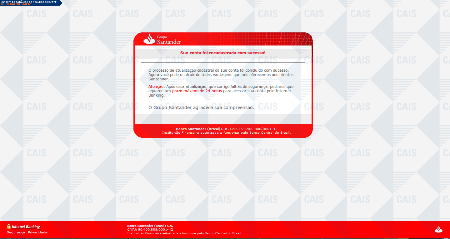 | comentário | A fraude se passa por um comunicado do banco Santander, que informa que a vítima deve realizar um procedimento para a correção de dados divergentes no banco de dados. O link para o suposto recadastramento leva a conteúdo malicioso que não estava mais disponível... (leia mais) | |
