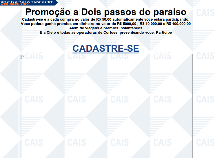 | comentário | A mensagem usa o nome da Cielo para divulgar a promoção "A dois passos do paraíso". O link para o cadastro na promoção leva a conteúdo malicioso que não estava mais disponível no momento da análise. | |