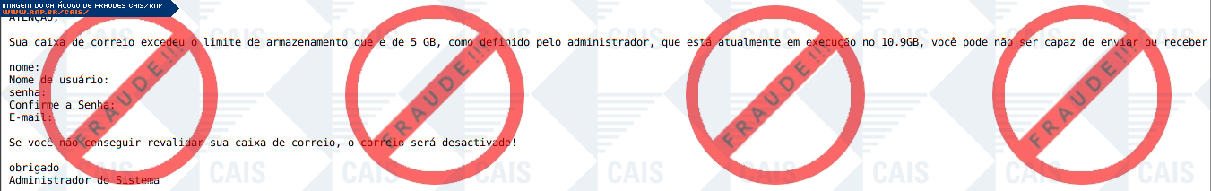 Esta página tem função informativa e educativa. Exibe uma coleção de imagens de phishing scam (fraudes eletrônicas) ou malware (código malicioso) veiculados por meio de spam (e-mail não-solicitado). Trata-se de conteúdo exemplificativo, não exaustivo, uma vez que não é possível contemplar todos os casos de fraudes existentes. Assim, caso você tenha conhecimento de um exemplar que não esteja aqui presente, isto não significa que não seja válido ou real. Inclusive incentivamos que você o envie para análise do CAIS para que, se for o caso, passe a integrar o nosso acervo.
