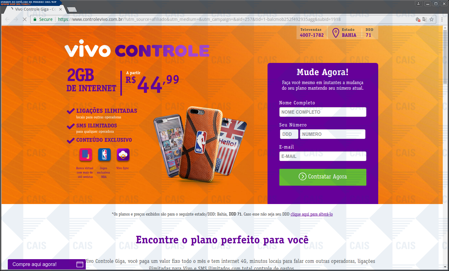 | comentário | O usuário recebe uma mensagem em nome da NET informando que é necessário realizar um cadastro no link disponibilizado para aderir ao plano de Internet, no entanto a página é falsa destinada a roubar as informações do usuário. | |