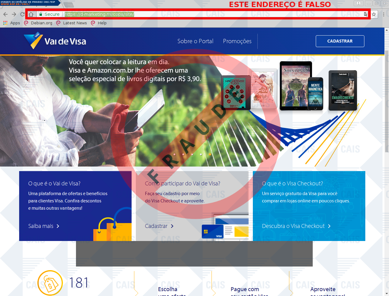 | comentário | A vítima recebe um e-mail informando sobre as vantagens da promoção Você na final com Visa do cartão Visa sendo o cadastro através do link disponibilizado, no entanto a página é falsa criada para roubar informações do usuário. | |
