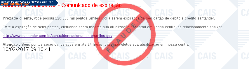 | comentário | A vítima recebe uma mensagem informando que sua conta no banco Santander deve evitar a expiração de pontos no link disponibilizado, no entanto a página é falsa destinada a roubar as informações bancárias do usuário. | |