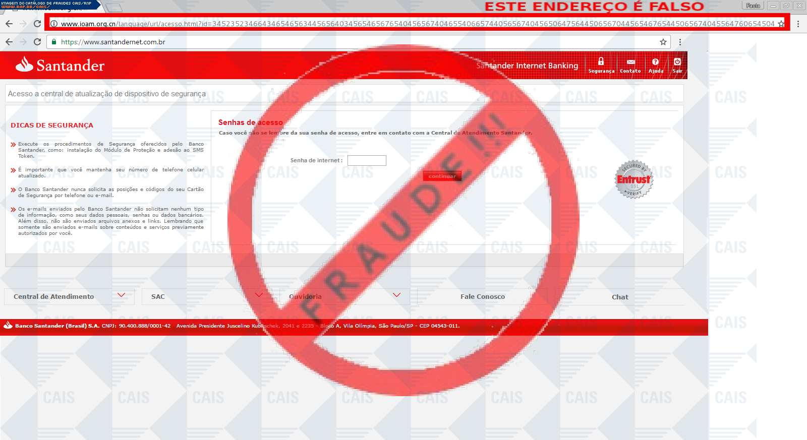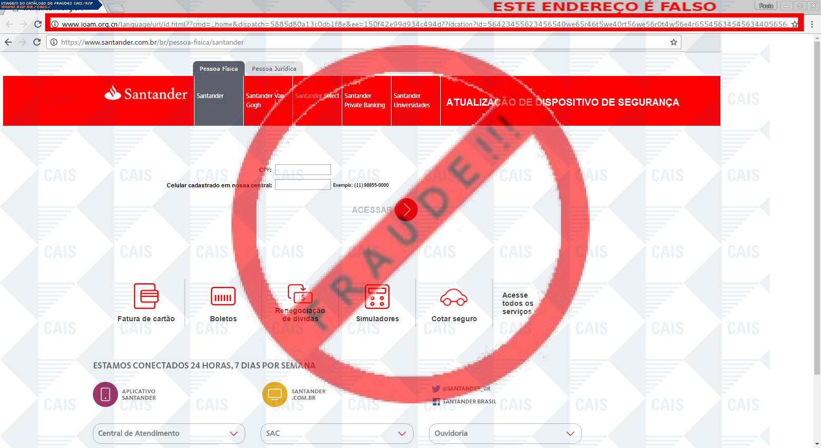 | comentário | A vítima recebe uma mensagem informando que sua conta no Santander deve realizar atualização de segurança no link disponibilizado, no entanto a página é falsa destinada a roubar as informações bancárias do usuário. | |