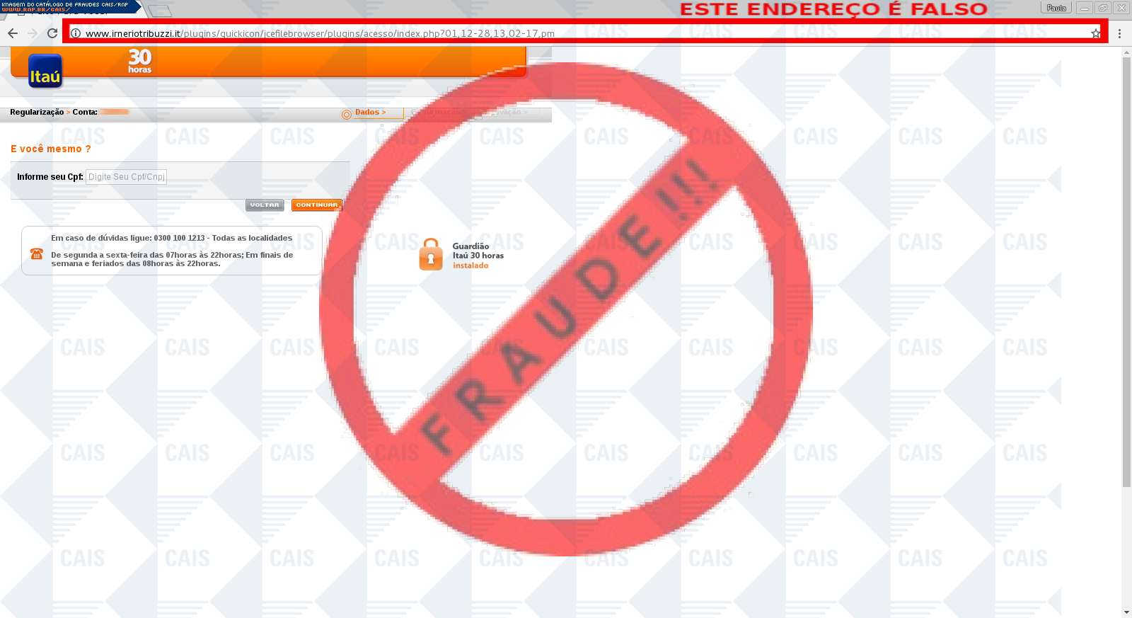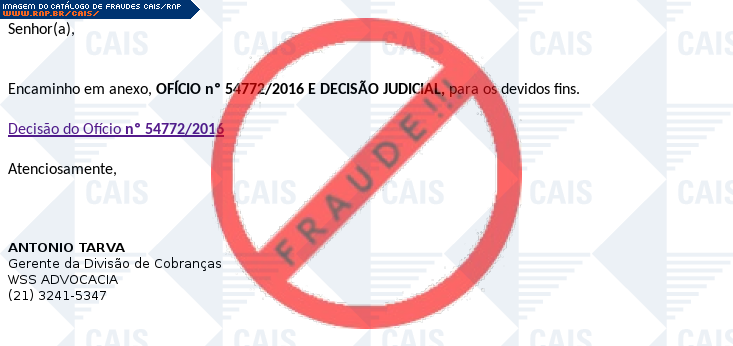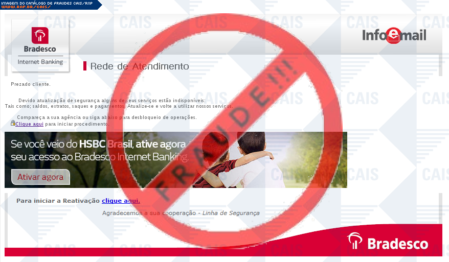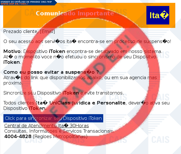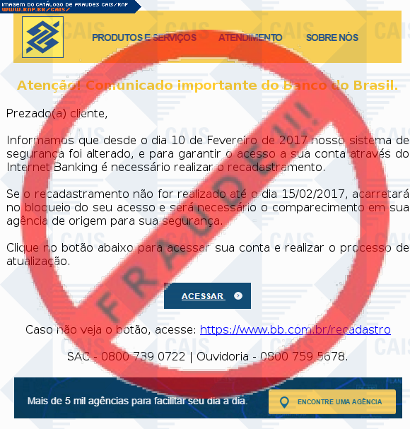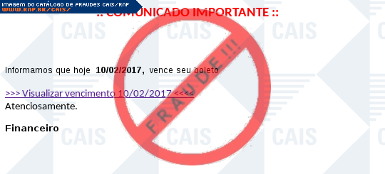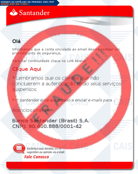 Esta página tem função informativa e educativa. Exibe uma coleção de imagens de phishing scam (fraudes eletrônicas) ou malware (código malicioso) veiculados por meio de spam (e-mail não-solicitado). Trata-se de conteúdo exemplificativo, não exaustivo, uma vez que não é possível contemplar todos os casos de fraudes existentes. Assim, caso você tenha conhecimento de um exemplar que não esteja aqui presente, isto não significa que não seja válido ou real. Inclusive incentivamos que você o envie para análise do CAIS para que, se for o caso, passe a integrar o nosso acervo.