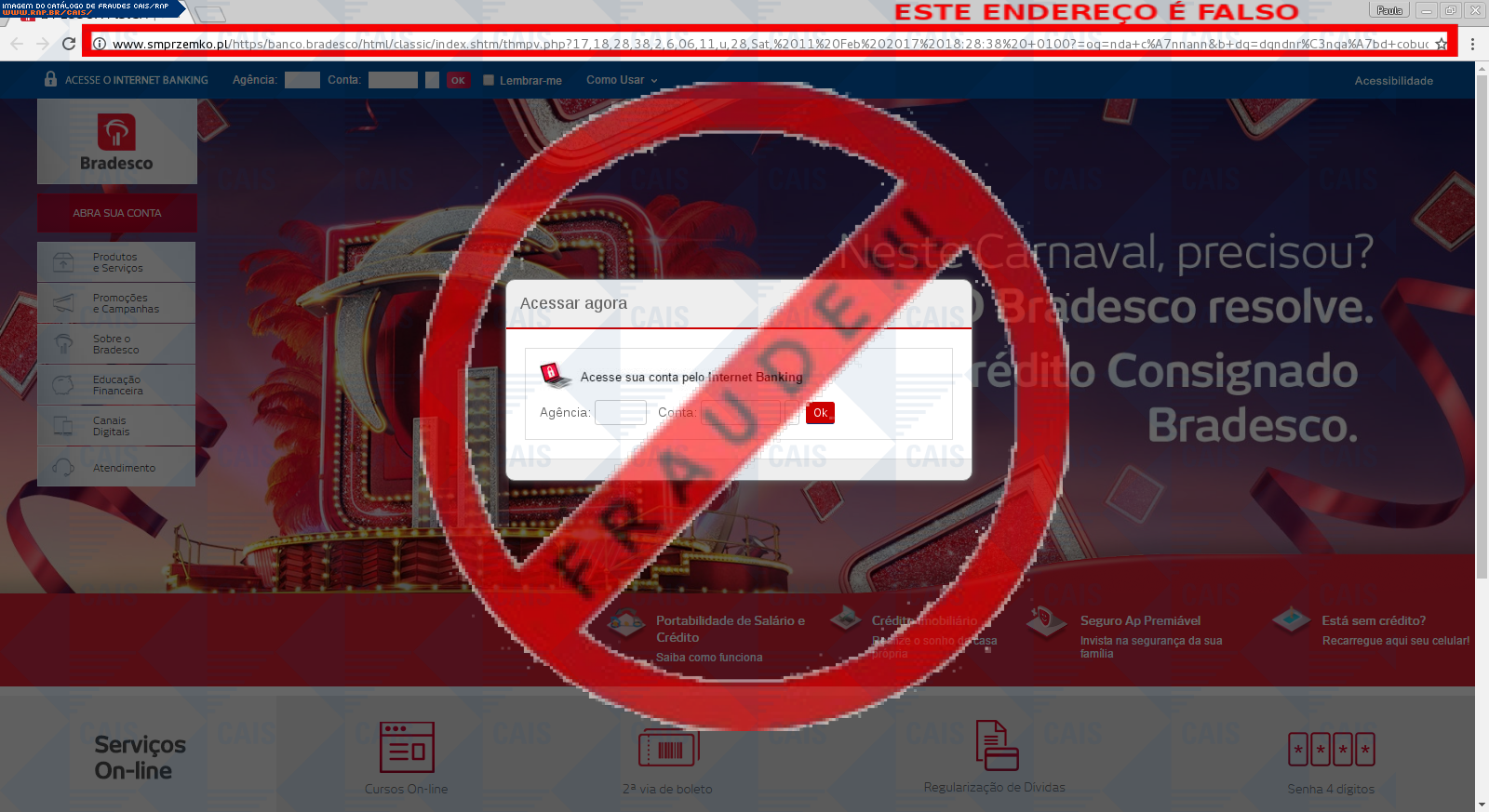 | comentário | A vítima recebe uma mensagem informando que sua conta no banco Bradesco deve realizar atualização de segurança no link disponibilizado, no entanto a página é falsa destinada a roubar as informações bancárias do usuário. | |