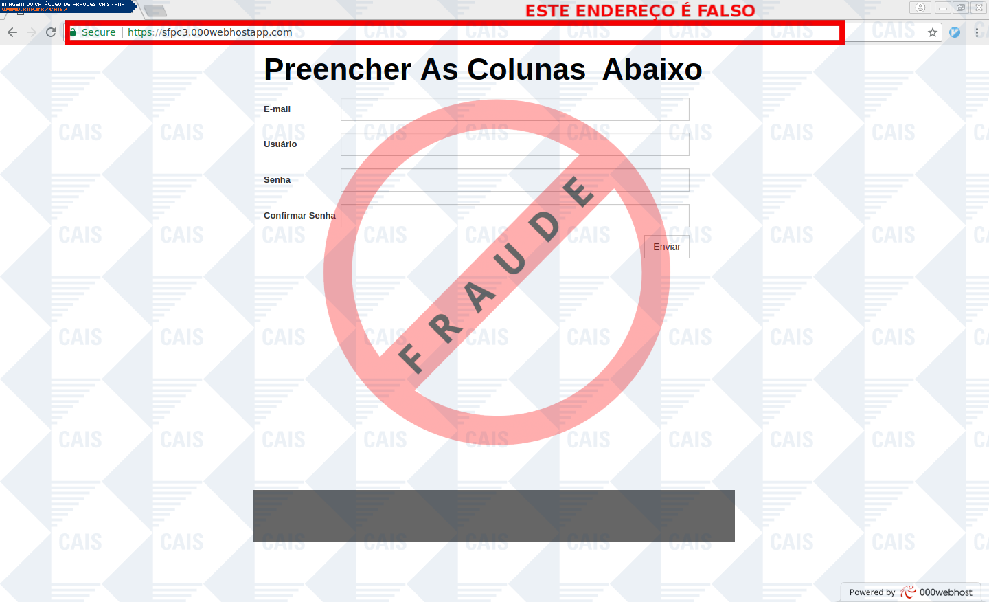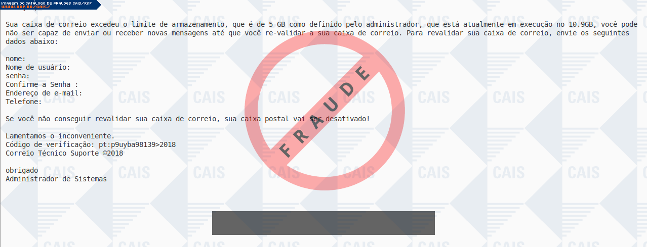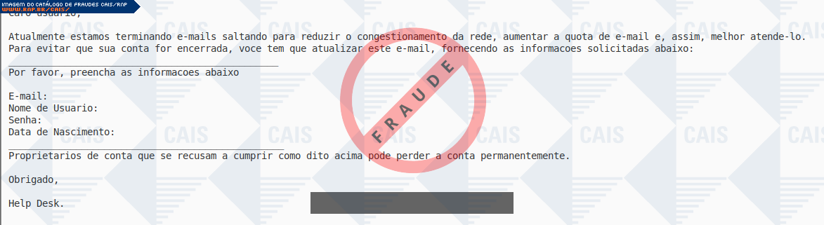 Esta página tem função informativa e educativa. Exibe uma coleção de imagens de phishing scam (fraudes eletrônicas) ou malware (código malicioso) veiculados por meio de spam (e-mail não-solicitado). Trata-se de conteúdo exemplificativo, não exaustivo, uma vez que não é possível contemplar todos os casos de fraudes existentes. Assim, caso você tenha conhecimento de um exemplar que não esteja aqui presente, isto não significa que não seja válido ou real. Inclusive incentivamos que você o envie para análise do CAIS para que, se for o caso, passe a integrar o nosso acervo.