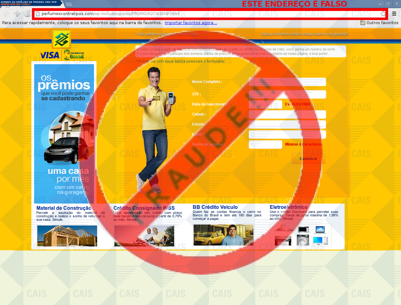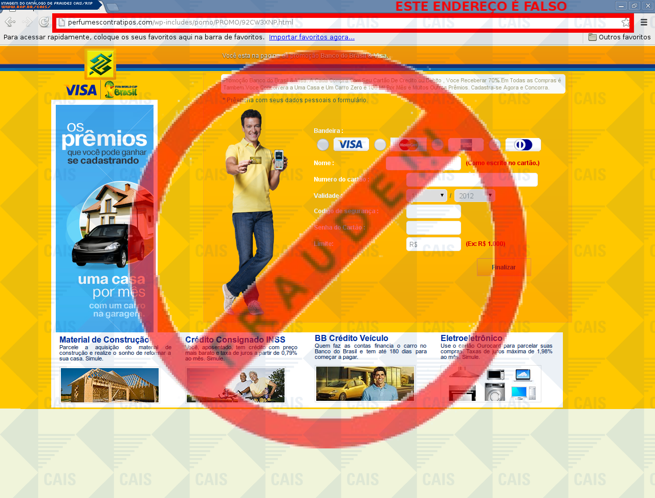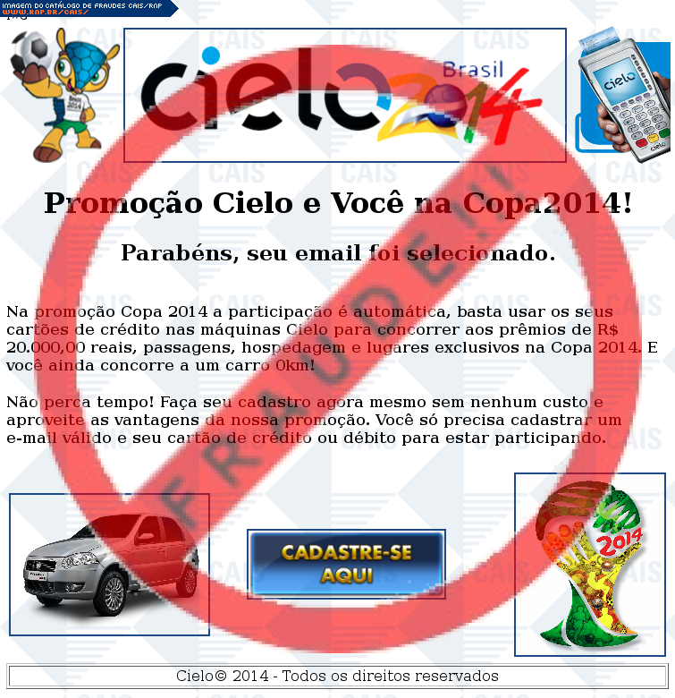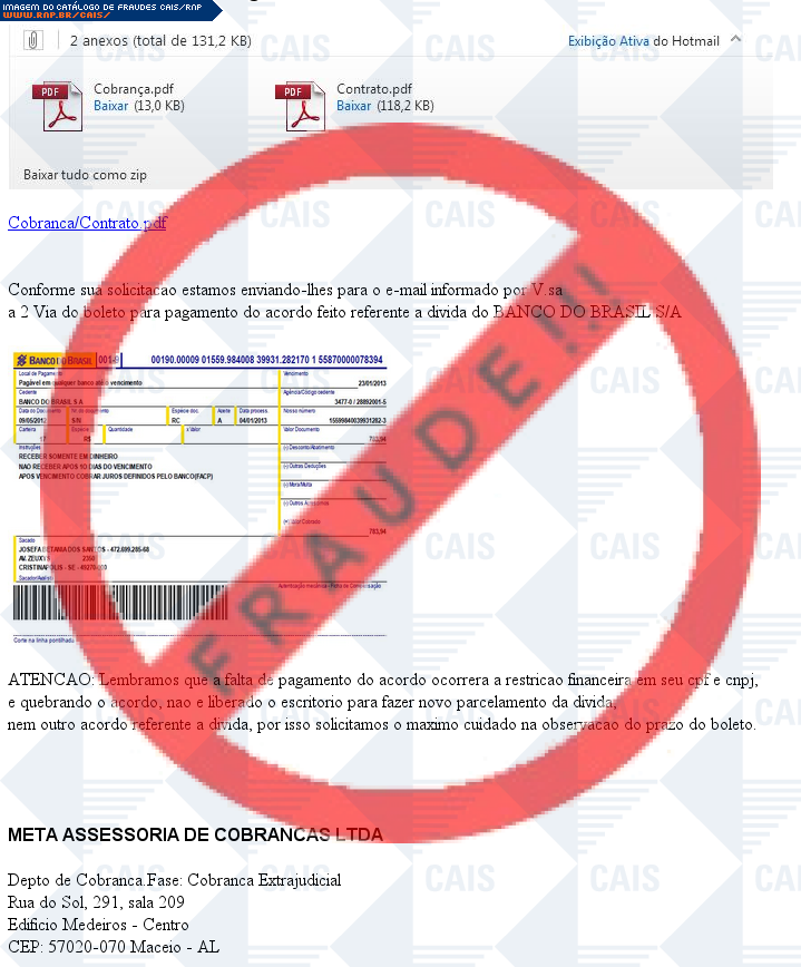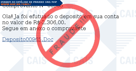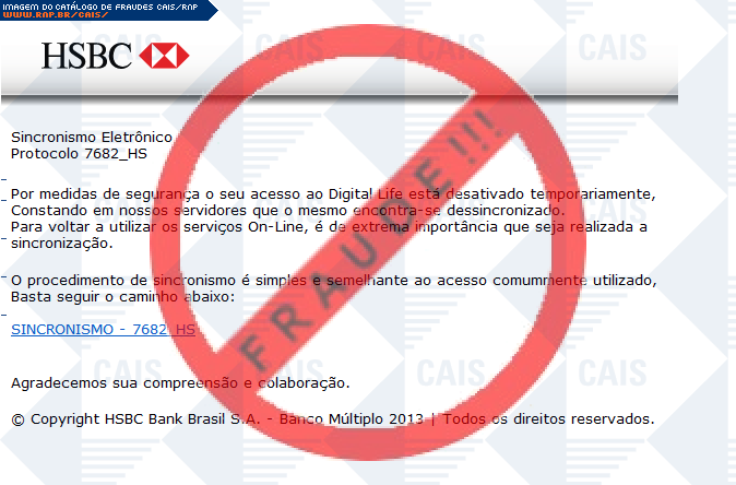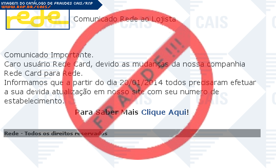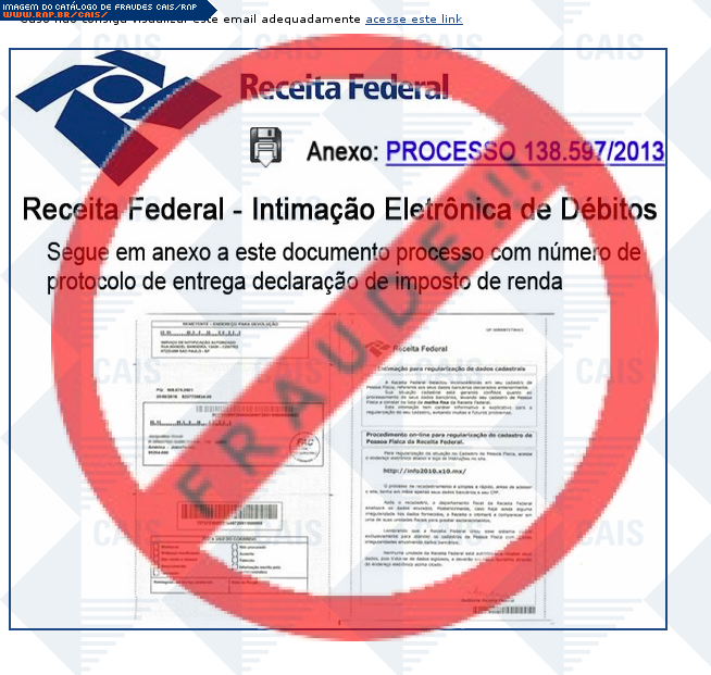 Esta página tem função informativa e educativa. Exibe uma coleção de imagens de phishing scam (fraudes eletrônicas) ou malware (código malicioso) veiculados por meio de spam (e-mail não-solicitado). Trata-se de conteúdo exemplificativo, não exaustivo, uma vez que não é possível contemplar todos os casos de fraudes existentes. Assim, caso você tenha conhecimento de um exemplar que não esteja aqui presente, isto não significa que não seja válido ou real. Inclusive incentivamos que você o envie para análise do CAIS para que, se for o caso, passe a integrar o nosso acervo.