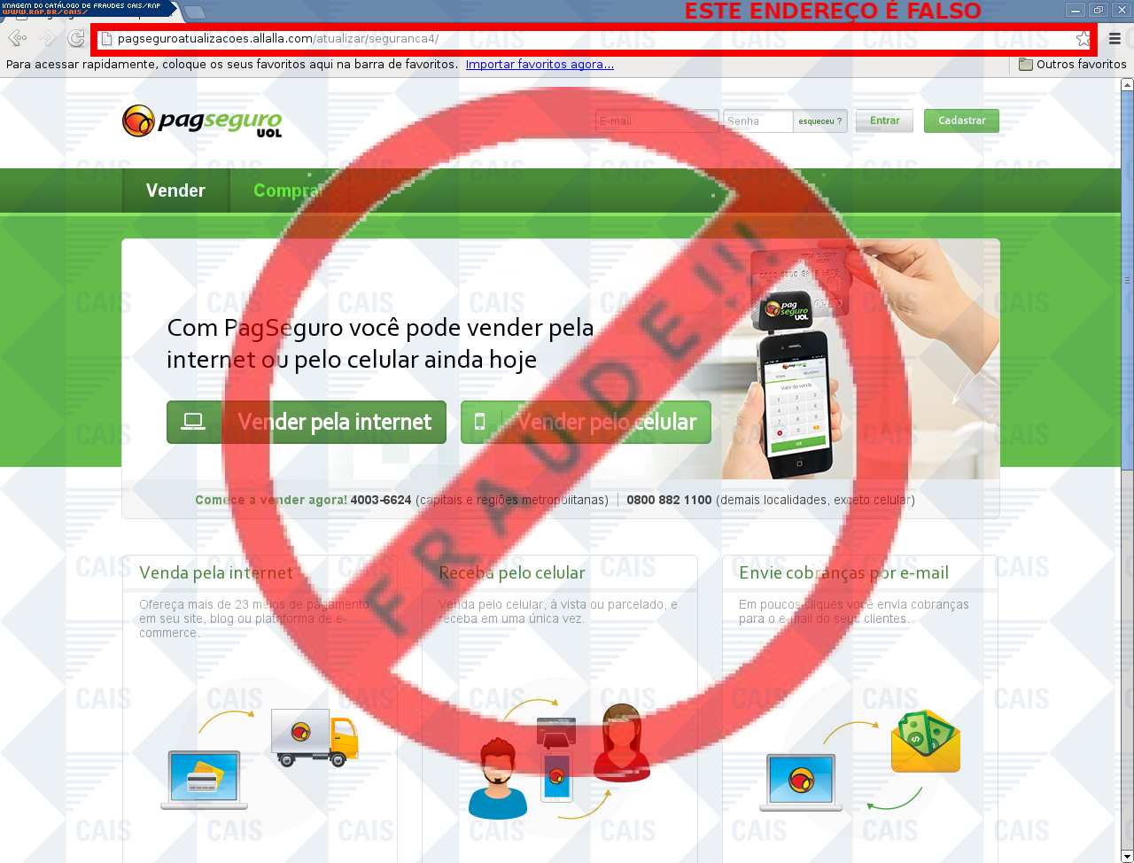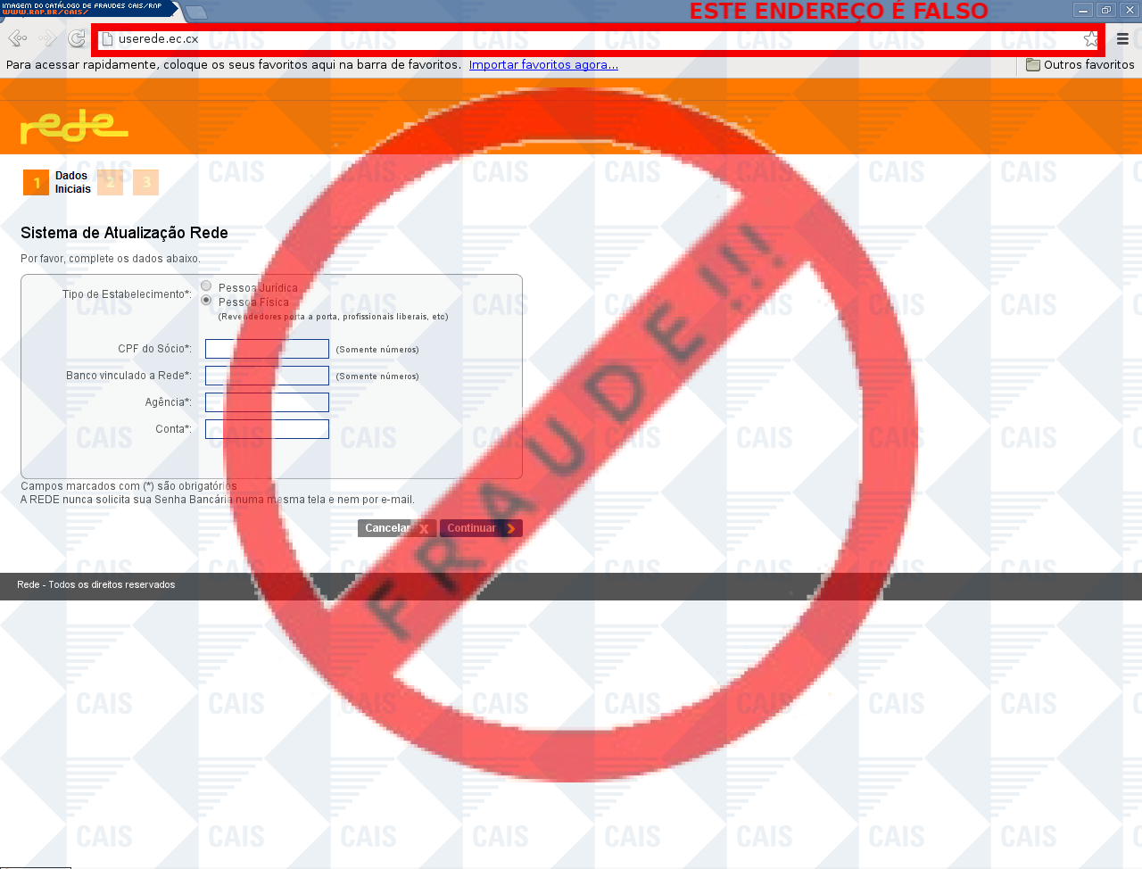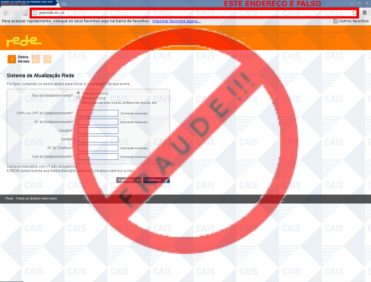 Esta página tem função informativa e educativa. Exibe uma coleção de imagens de phishing scam (fraudes eletrônicas) ou malware (código malicioso) veiculados por meio de spam (e-mail não-solicitado). Trata-se de conteúdo exemplificativo, não exaustivo, uma vez que não é possível contemplar todos os casos de fraudes existentes. Assim, caso você tenha conhecimento de um exemplar que não esteja aqui presente, isto não significa que não seja válido ou real. Inclusive incentivamos que você o envie para análise do CAIS para que, se for o caso, passe a integrar o nosso acervo.