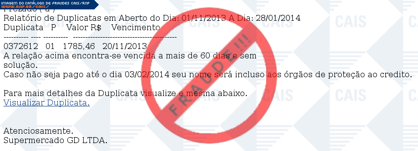 | comentário | A vítima recebe uma mensagem, contendo um link para uma suposta duplicata, mas ao clicar no link inicia-se o download de um malware. | |