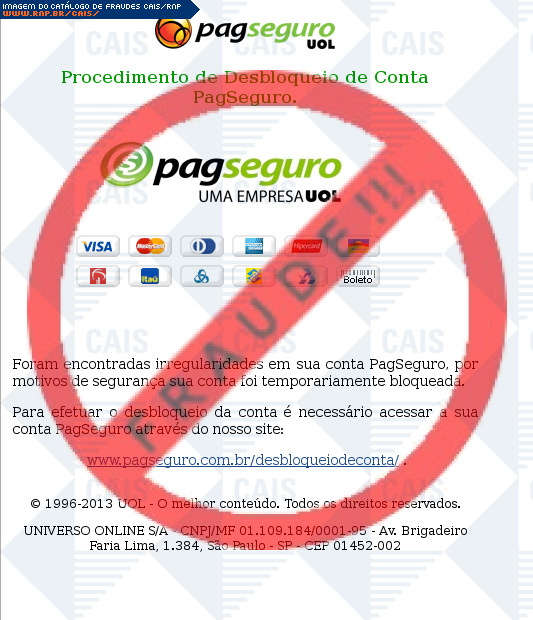 | comentário | A vítima recebe uma mensagem, informando que sua conta PagSeguro foi temporariamente bloqueada. Mas ao clicar no link para realizar o desbloqueio, a vítima é direcionada para uma página falsa. | |
