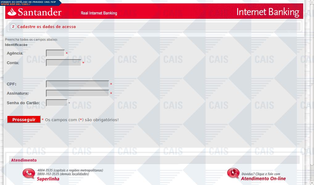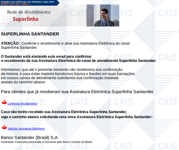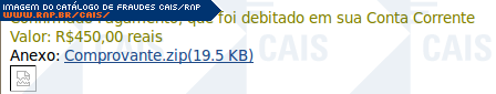 Esta página tem função informativa e educativa. Exibe uma coleção de imagens de phishing scam (fraudes eletrônicas) ou malware (código malicioso) veiculados por meio de spam (e-mail não-solicitado). Trata-se de conteúdo exemplificativo, não exaustivo, uma vez que não é possível contemplar todos os casos de fraudes existentes. Assim, caso você tenha conhecimento de um exemplar que não esteja aqui presente, isto não significa que não seja válido ou real. Inclusive incentivamos que você o envie para análise do CAIS para que, se for o caso, passe a integrar o nosso acervo.