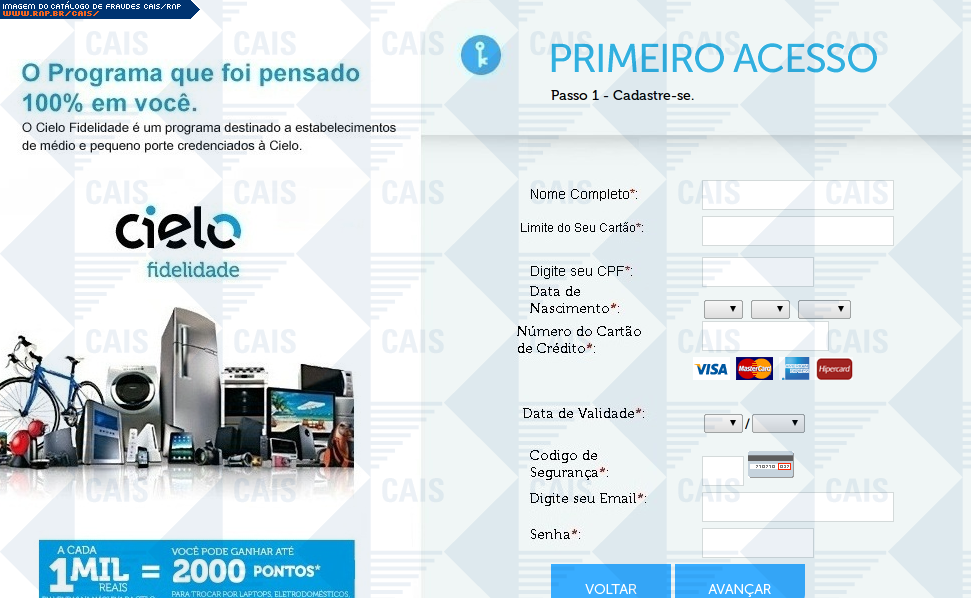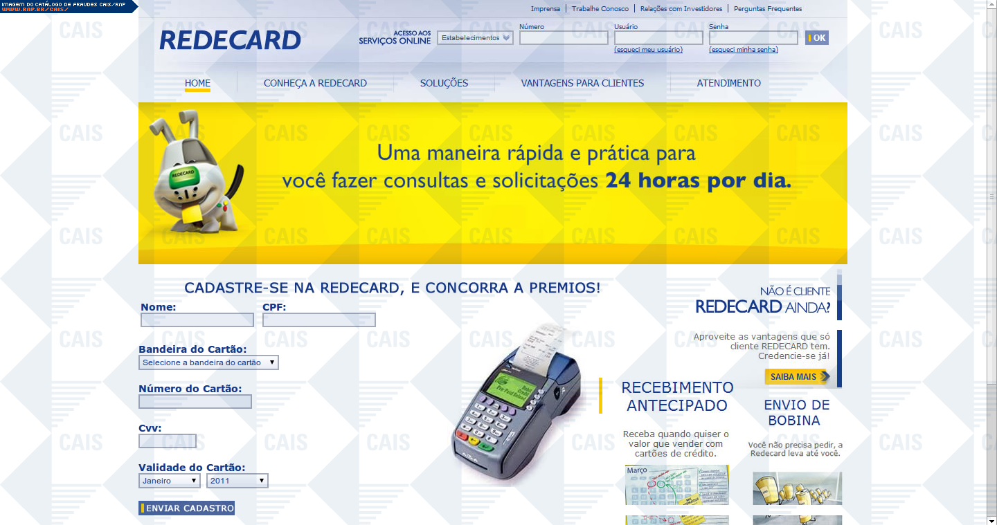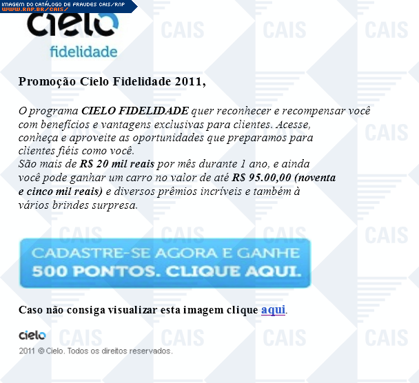 comentário A fraude oferece cadastro em promoção da Cielo na qual a vítima supostamente concorre a prêmios em dinheiro. Havia um link para tal cadastro, porém este apontava para uma falsa página da Cielo, na qual dados confidenciais eram solicitados.