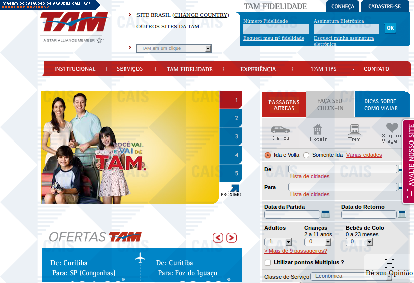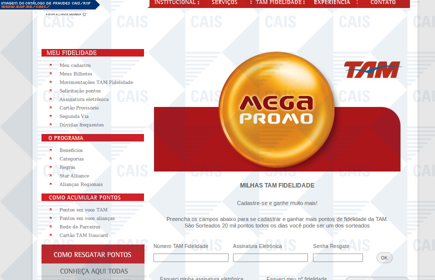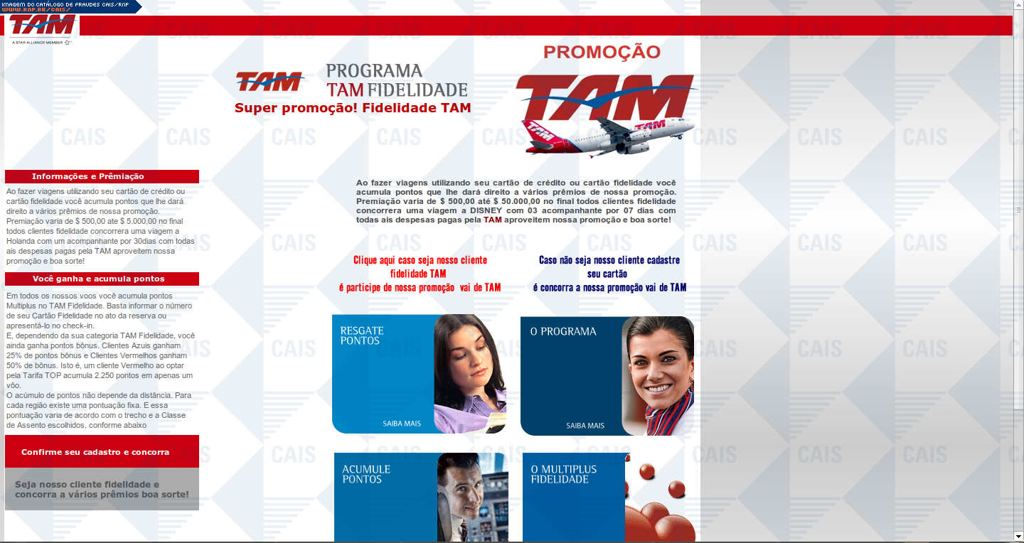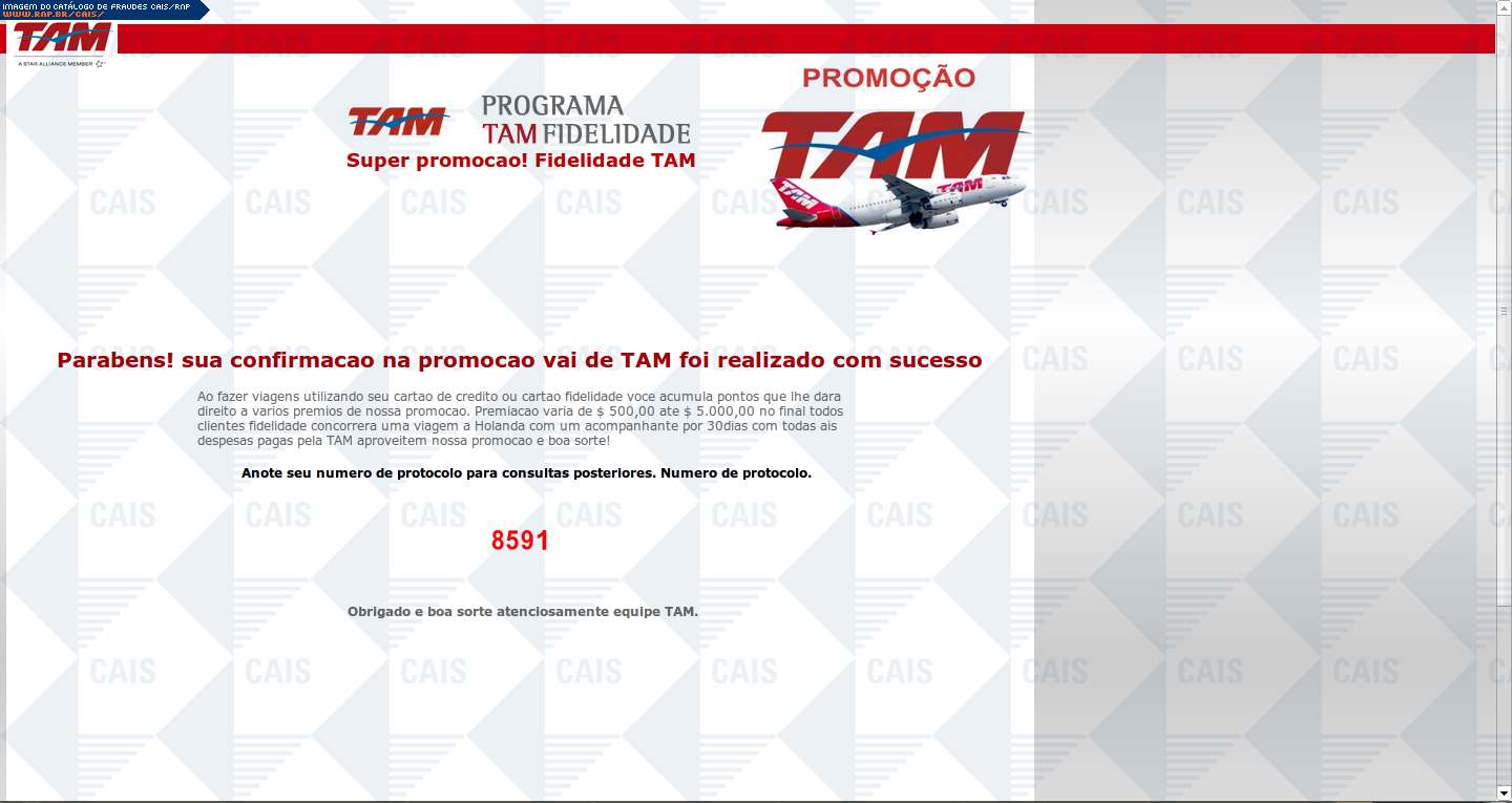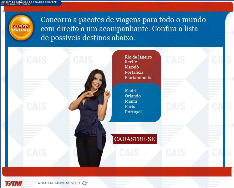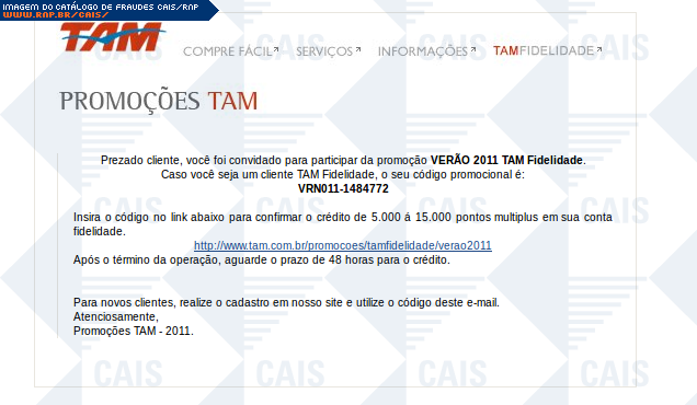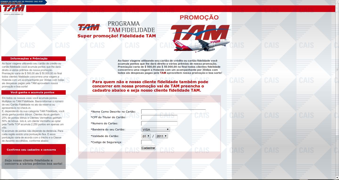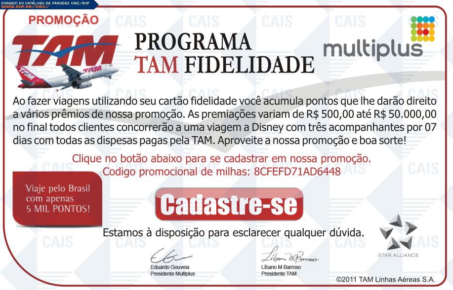 comentário A fraude contém um link para o cadastro em uma suposta promoção da TAM. O link leva a uma página falsa destinada a coletar dados pessoais da vítima.