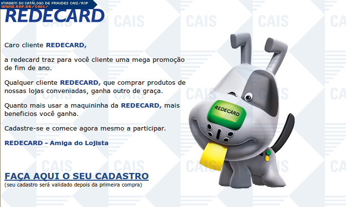 comentário A mensagem contém um link para o cadastro na promoção de fim de ano da REDECARD. O link para o cadastro na promoção leva a uma página falsa que tem o objetivo de coletar dados pessoais da vítima.