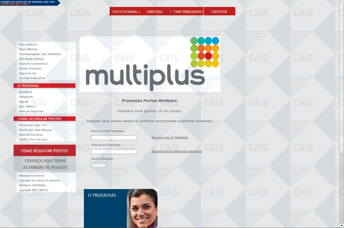 comentário A fraude em nome da TAM, convida a vítima a participar de uma promoção na qual já estariam garantidos de 5.000 a 15.000 pontos multiplus. Havia um link para cadastro na promoção, porém este tratava-se de uma falsa página da TAM, onde dados importantes eram... (leia mais)