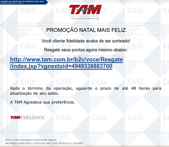 comentário A mensagem informa que a vítima foi sorteada em uma promoção da TAM. O link para o resgate do prêmio leva a um site falso que tem o objetivo de coletar dados pessoais da vítima.
