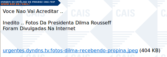 comentário A mensagem contém um link para supostas fotos da presidente Dilma recebendo propina. O conteúdo malicioso não estava disponível no momento da análise.