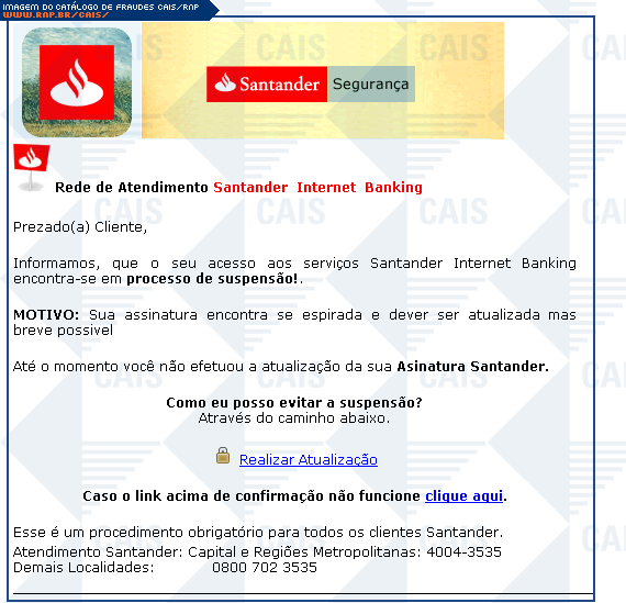 comentário A fraude alega que a conta da vítima no santander encontra-se em suspensão e uma atualização é necessária. Porem o link existente para tal atualização, leva a uma falsa pagina do santander, na qual dados importantes eram solicitados.