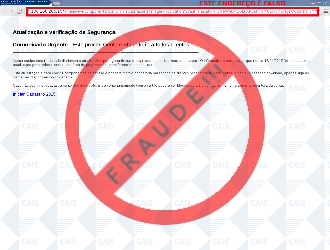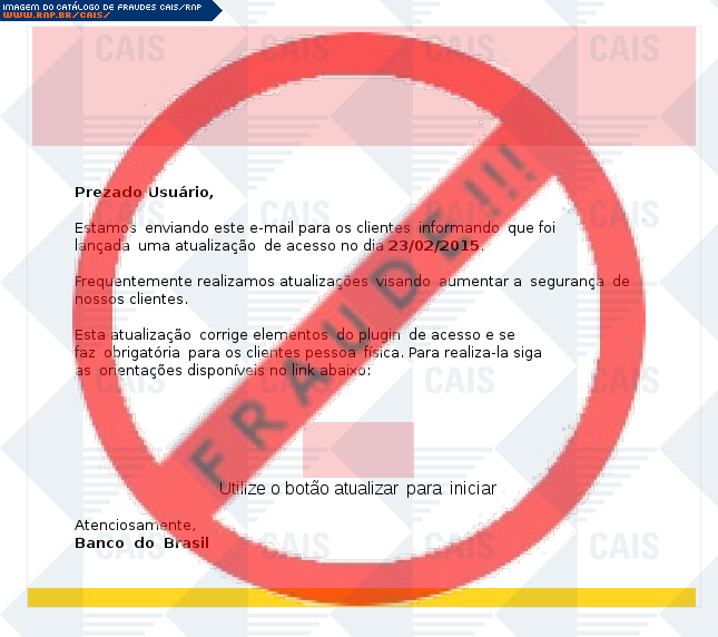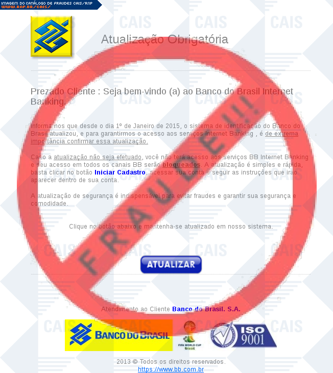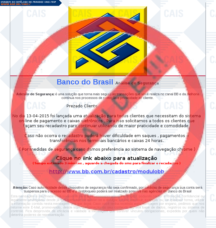 Esta página tem função informativa e educativa. Exibe uma coleção de imagens de phishing scam (fraudes eletrônicas) ou malware (código malicioso) veiculados por meio de spam (e-mail não-solicitado). Trata-se de conteúdo exemplificativo, não exaustivo, uma vez que não é possível contemplar todos os casos de fraudes existentes. Assim, caso você tenha conhecimento de um exemplar que não esteja aqui presente, isto não significa que não seja válido ou real. Inclusive incentivamos que você o envie para análise do CAIS para que, se for o caso, passe a integrar o nosso acervo.