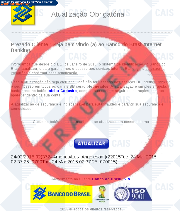 | comentário | O usuário recebe uma mensagem informando que o sistema do Banco do Brasil lançou uma nova atualização para os clientes que utilizam serviços online, no entanto a página é falsa destinada a roubar as informações bancárias do usuário. | |