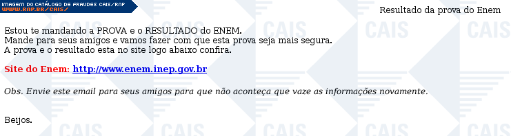 | comentário | Fraude se passando por mensagem de suposta amiga enviando link para a prova do ENEM. O link direciona a vítima para conteúdo malicioso não disponível no momento da análise. | |