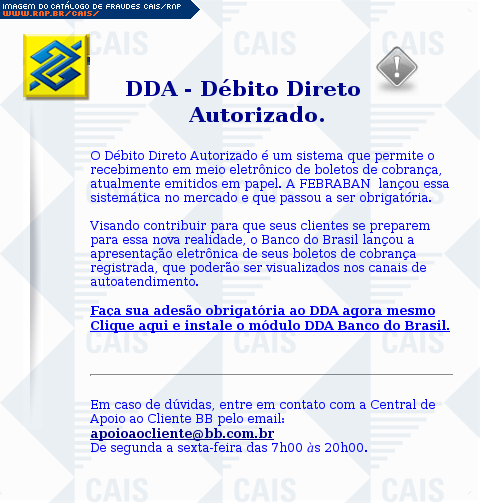 Esta página tem função informativa e educativa. Exibe uma coleção de imagens de phishing scam (fraudes eletrônicas) ou malware (código malicioso) veiculados por meio de spam (e-mail não-solicitado). Trata-se de conteúdo exemplificativo, não exaustivo, uma vez que não é possível contemplar todos os casos de fraudes existentes. Assim, caso você tenha conhecimento de um exemplar que não esteja aqui presente, isto não significa que não seja válido ou real. Inclusive incentivamos que você o envie para análise do CAIS para que, se for o caso, passe a integrar o nosso acervo.
