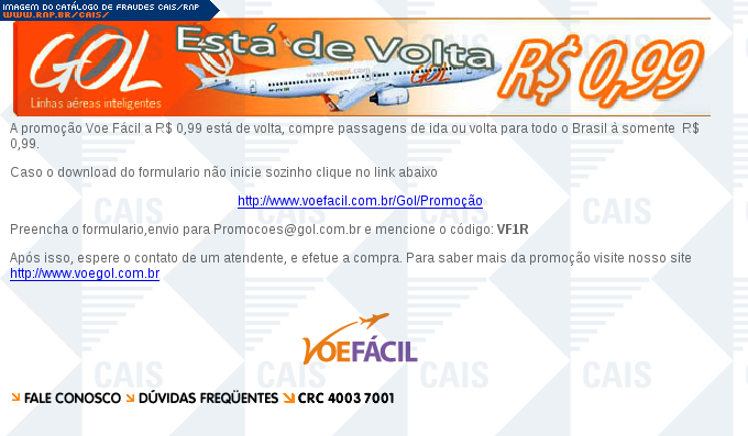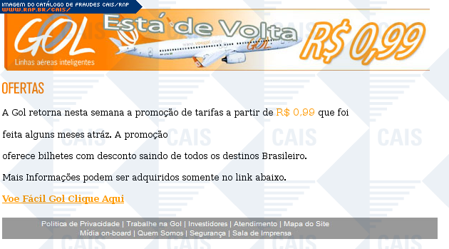 | comentário | Mensagem falsa se passando pela GOL divulgando suposta promoção com passagens aéreas a R$ 0,99. A fraude fornece um link para visualização de mais detalhes sobre a promoção. Tal link, na verdade, leva a vítima a uma página falsa tentando se passar pela página... (leia mais) | |
