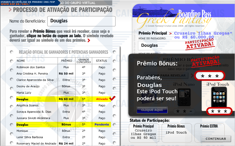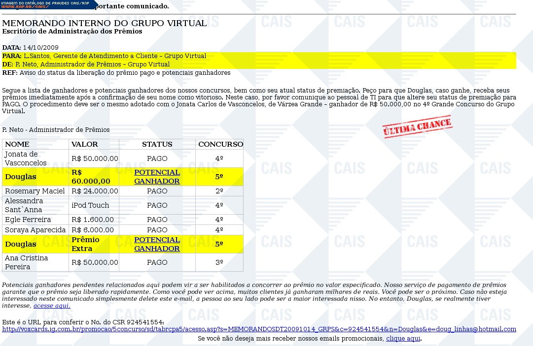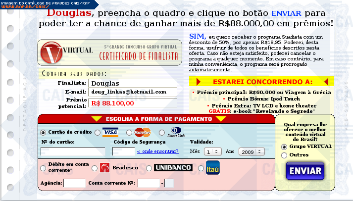 | comentário | Fraude com suposto concurso de prêmios de um tal Grupo Virtual. A mensagem diz que a vítima foi o contemplado do concurso e deveria acessar a página indicada por um link para ter acesso aos prêmios e concorrer a brindes extras. Na página indicada alguns a... (leia mais) | |