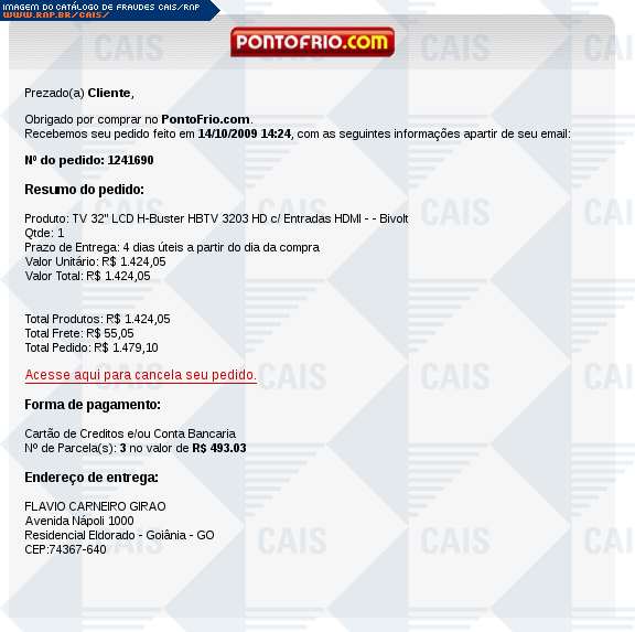 | comentário | E-mail que utiliza o nome do Ponto Frio com informações sobre uma suposta compra de uma TV LCD. Na mensagem há um link que redirecionaria para o cancelamento da compra, porém ao acessá-lo é feito o download do arquivo malicioso identificado como Gen:Trojan.Heur.PT.bm0@aa9S1Pgi... (leia mais) | |