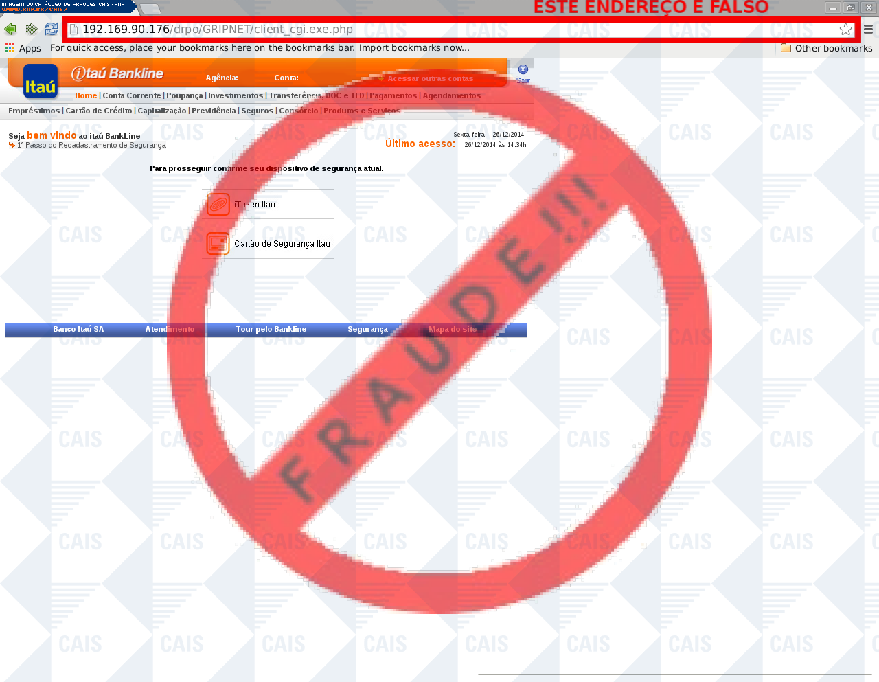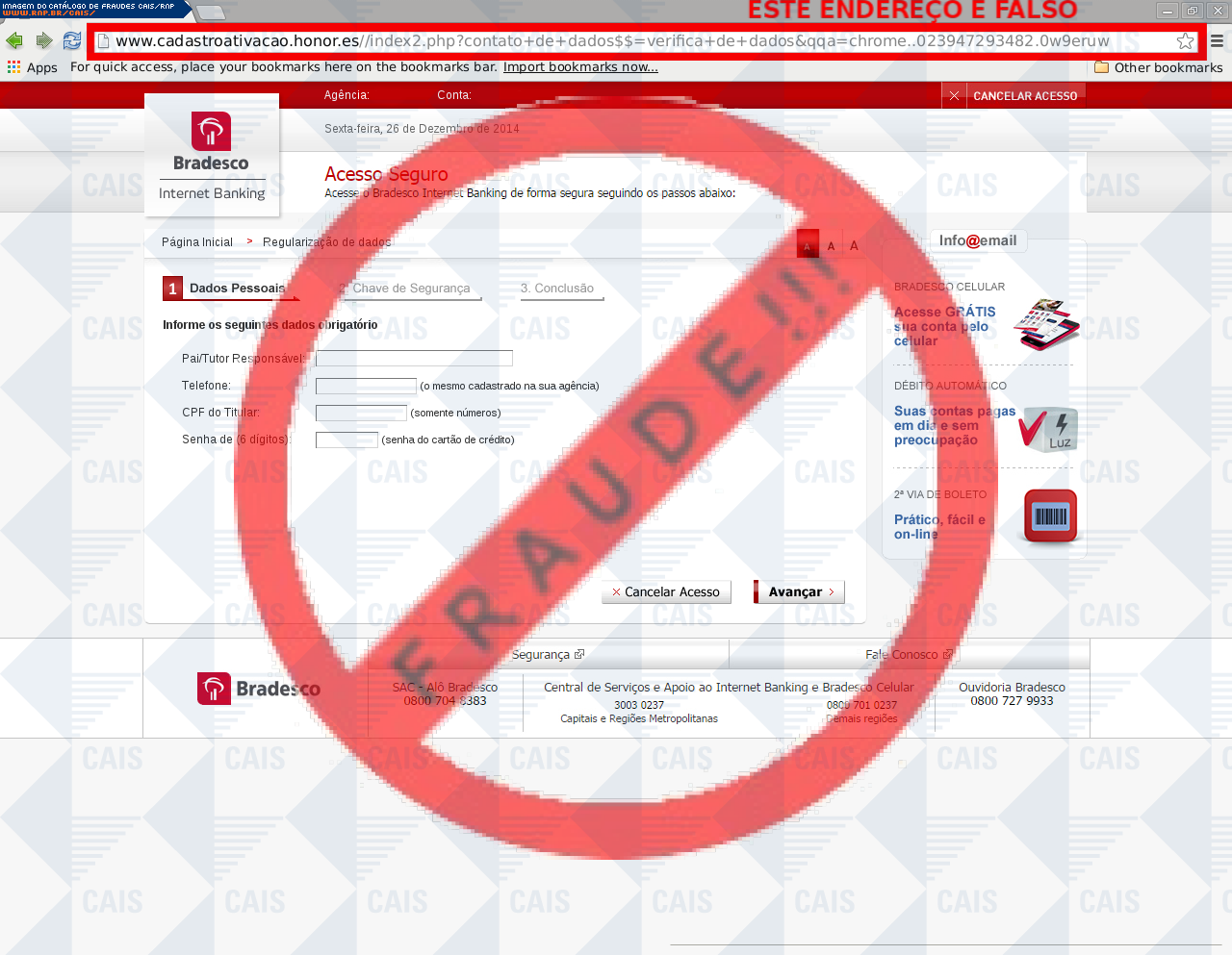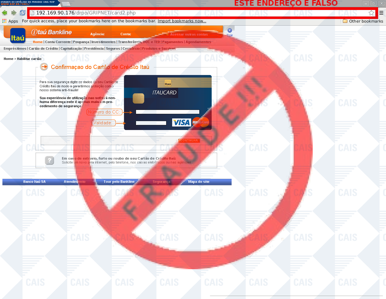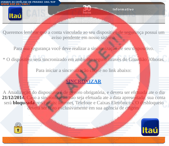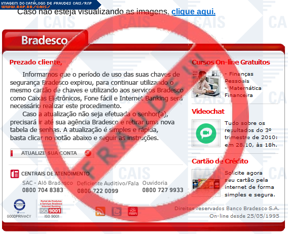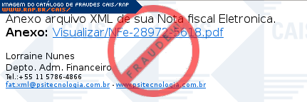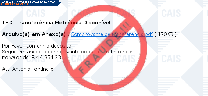 Esta página tem função informativa e educativa. Exibe uma coleção de imagens de phishing scam (fraudes eletrônicas) ou malware (código malicioso) veiculados por meio de spam (e-mail não-solicitado). Trata-se de conteúdo exemplificativo, não exaustivo, uma vez que não é possível contemplar todos os casos de fraudes existentes. Assim, caso você tenha conhecimento de um exemplar que não esteja aqui presente, isto não significa que não seja válido ou real. Inclusive incentivamos que você o envie para análise do CAIS para que, se for o caso, passe a integrar o nosso acervo.