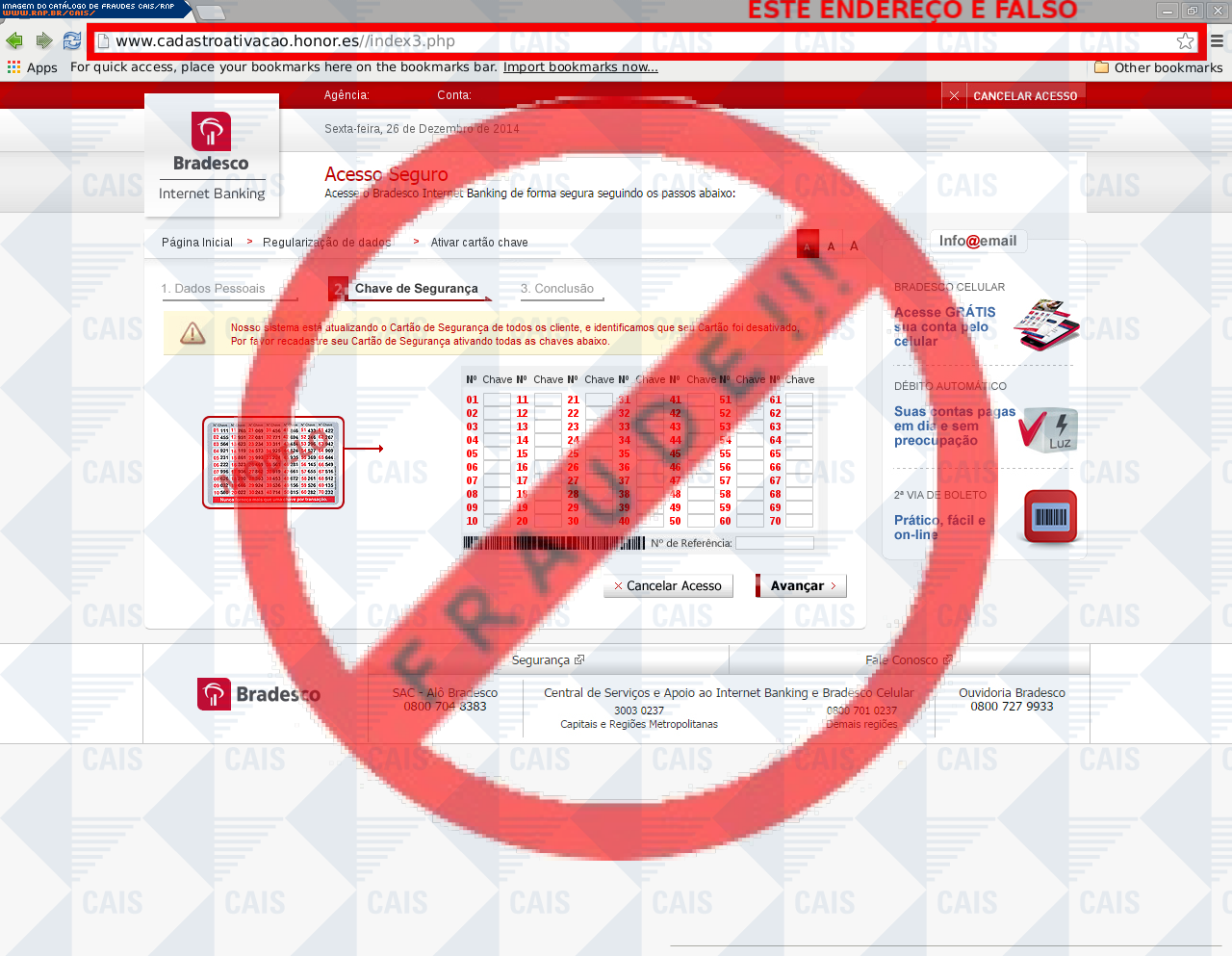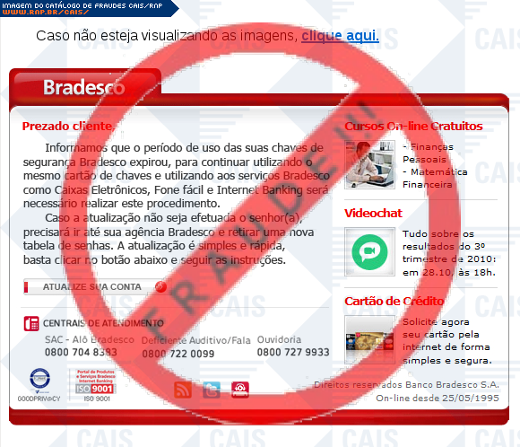 | comentário | O usuário recebe um e-mail informando que sua chave de segurança da conta do banco Bradesco expirou sendo necessário realizar uma atualização no link disponibilizado, entretanto a página fornecida é falsa criada para roubar os dados bancários da vítima. | |