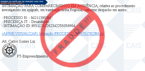 | comentário | A vítima recebe uma mensagem contendo uma intimação judicial disponível para download no entanto o arquivo gerado é malicioso destinado a roubar informações do usuário com o nome de Trojan.Win32.Generic!BT. | |