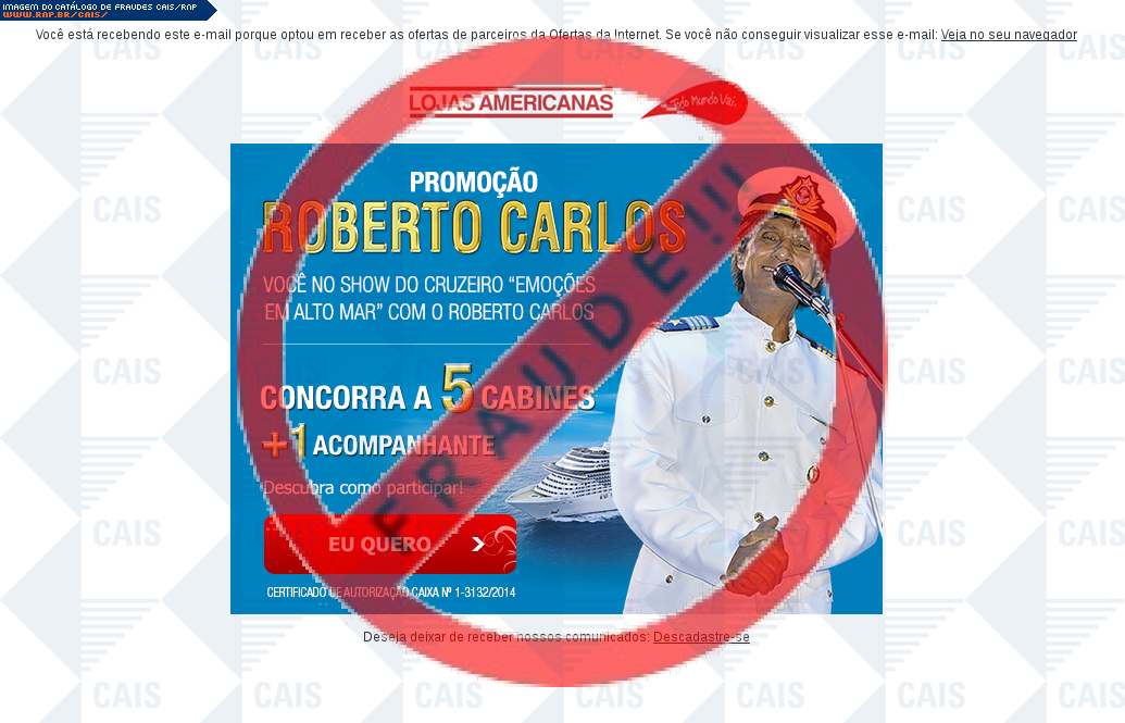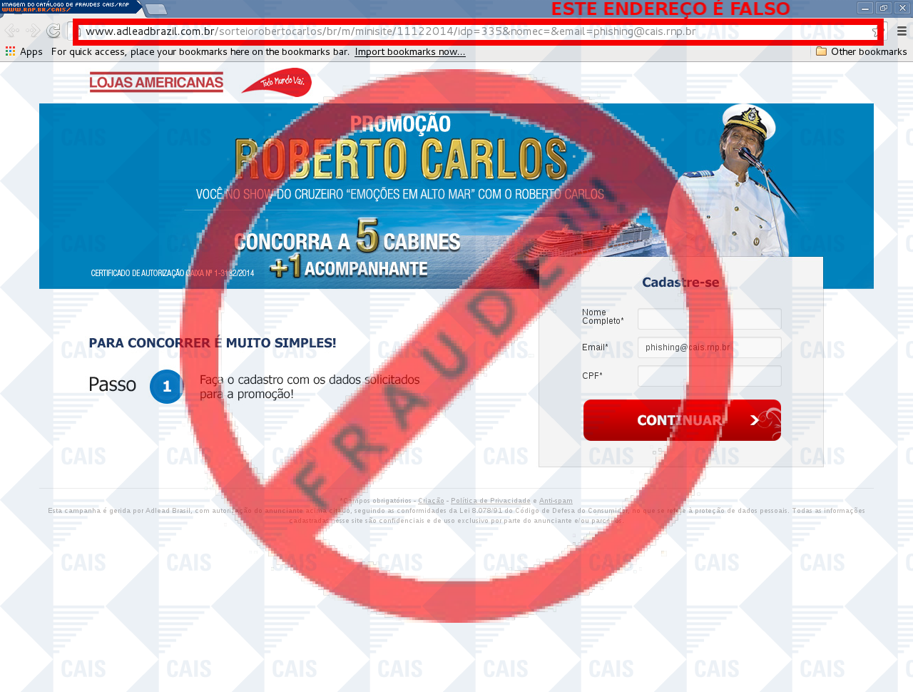 | comentário | A vítima recebe um e-mail sobre uma promoção da Lojas Americanas referente ao Cruzeiro com Roberto Carlos, no entanto o site para inscrição é falso criado para roubar dados do usuário. | |