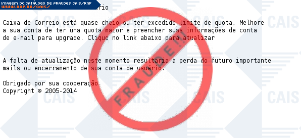 | comentário | A vítima recebe uma mensagem, informando que sua caixa de correio está quase cheia e precisa fazer um upgrade para aumentar o espaço. Mas ao clicar no link, a vítima é direcionada para uma página falsa, que é usada para roubar contas de emails. | |