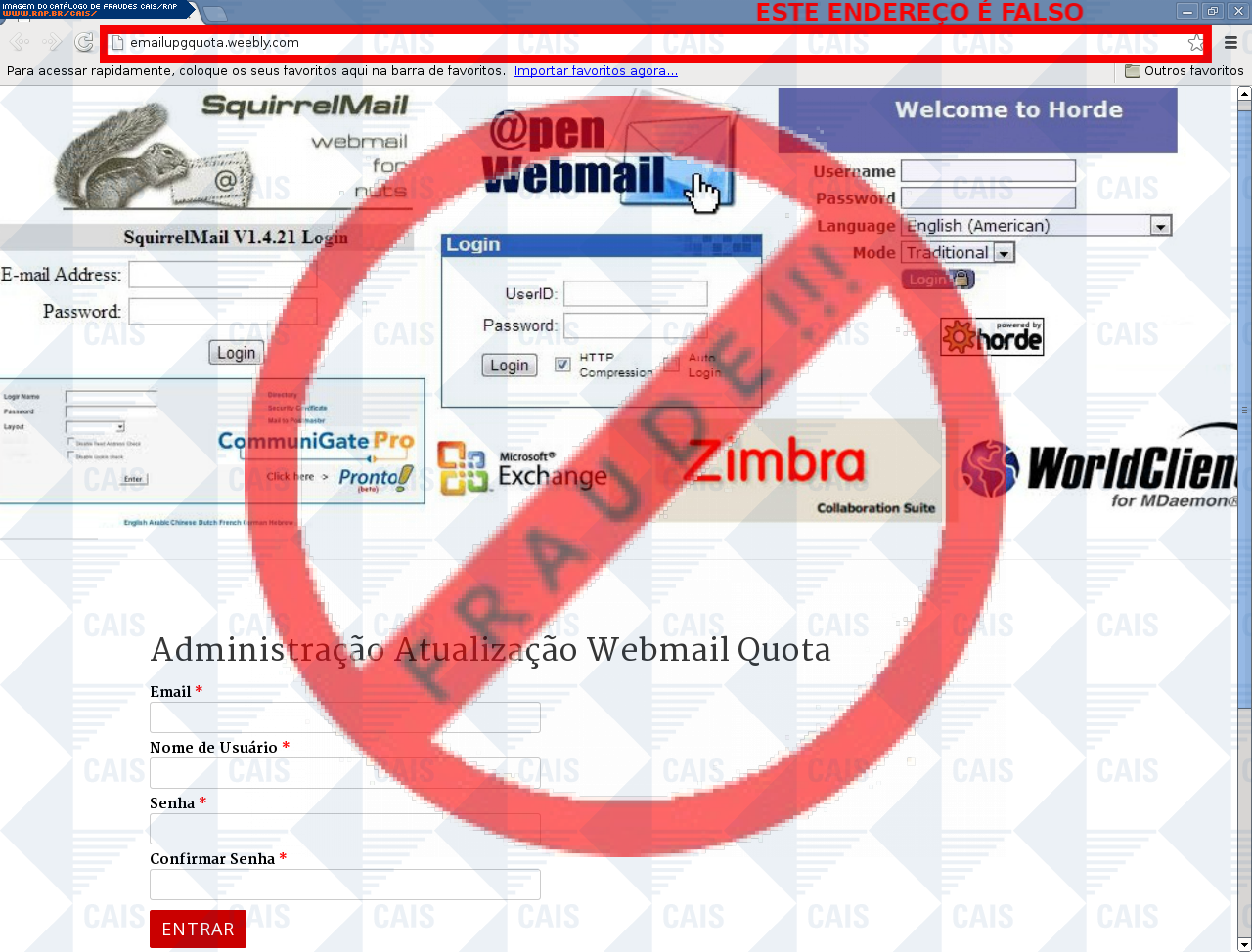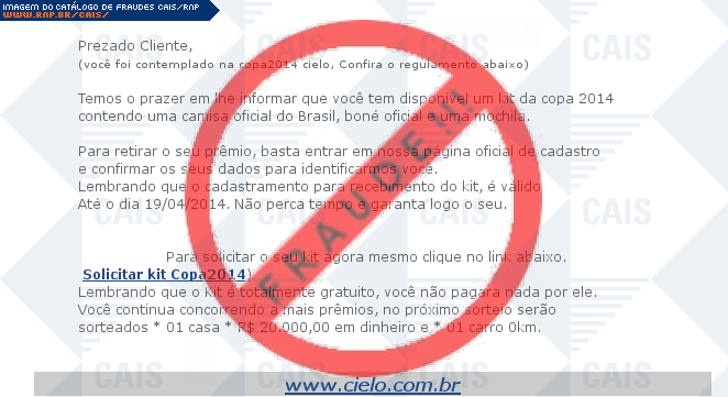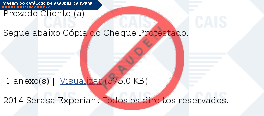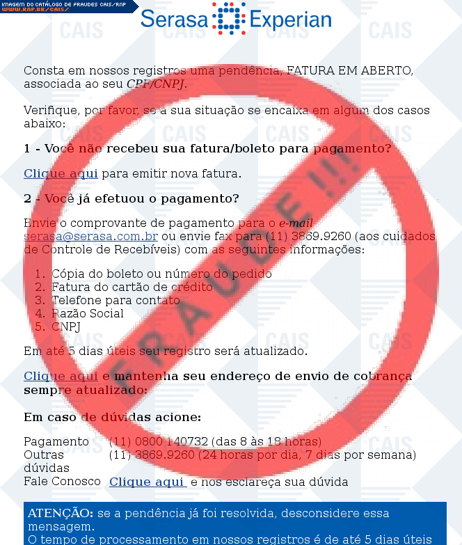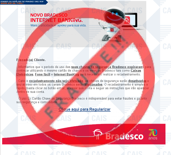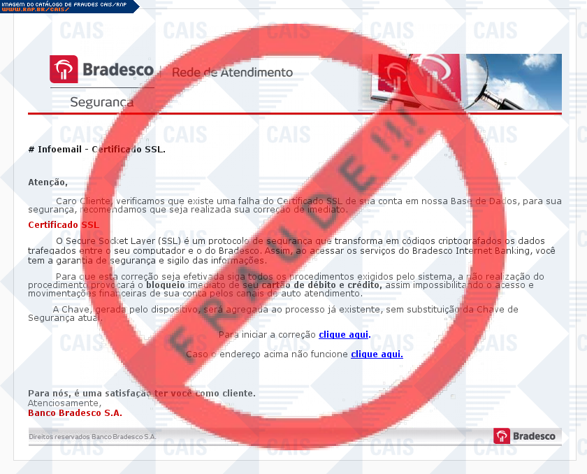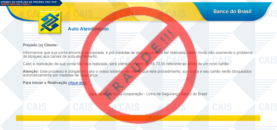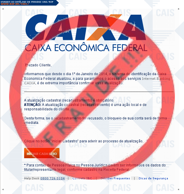 Esta página tem função informativa e educativa. Exibe uma coleção de imagens de phishing scam (fraudes eletrônicas) ou malware (código malicioso) veiculados por meio de spam (e-mail não-solicitado). Trata-se de conteúdo exemplificativo, não exaustivo, uma vez que não é possível contemplar todos os casos de fraudes existentes. Assim, caso você tenha conhecimento de um exemplar que não esteja aqui presente, isto não significa que não seja válido ou real. Inclusive incentivamos que você o envie para análise do CAIS para que, se for o caso, passe a integrar o nosso acervo.